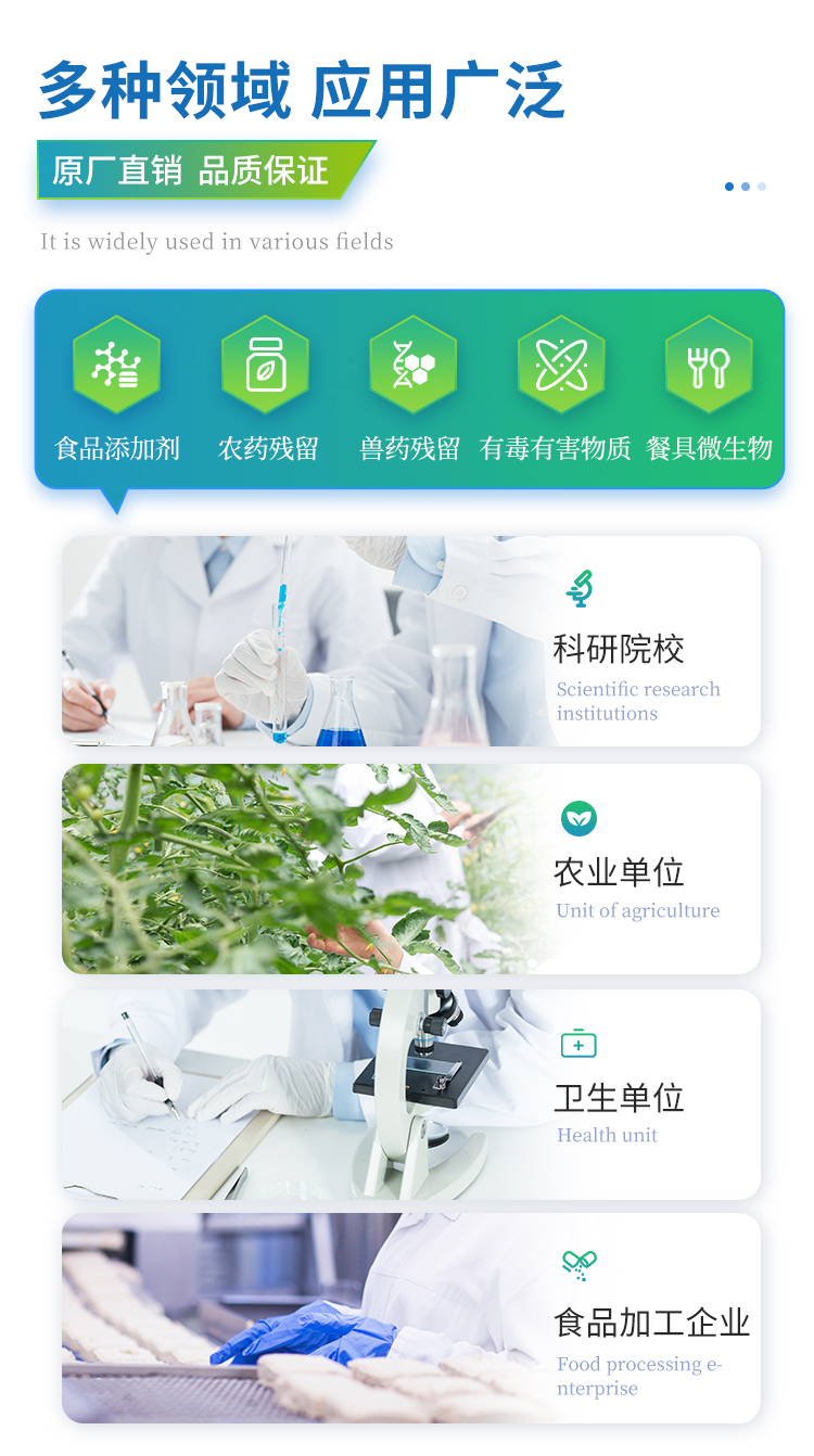 食品添加劑:二氧化硫、雙氧水、亞硝酸鹽、硝酸鹽、苯甲酸鈉、山梨酸鉀、糖精鈉、甜蜜素、木耳硫酸鎂等有毒有害物質:甲醛、吊白塊、硼砂、過氧化苯甲酰、溴酸鉀、羅丹明B、三聚氰胺、蘇丹紅、工業堿、尿素、明礬等果蔬:農藥殘留(酶抑制率法)病害肉:組胺、揮發性鹽基氮重金屬含量:鉛、鎘、鉻、汞、砷、錫、鎳、鋁等水酒飲品分析:酒中甲醇、乙醇、乳品及牛奶中蛋白質調味品成分: 食醋的總酸、醬油的總酸、芝麻油純度、谷氨酸鈉、醬油氨基酸態氮、食鹽中亞鐵氰化鉀、食鹽中碘等食用色素類:紅色色素(胭脂紅、莧菜紅、莧菜紅)、黃色色素(檸檬黃、日落黃)、藍色色素(亮藍)等蜂蜜成分:果糖和葡萄糖、蔗糖、淀粉酶、酸度等食用油脂:過氧化值、酸價等