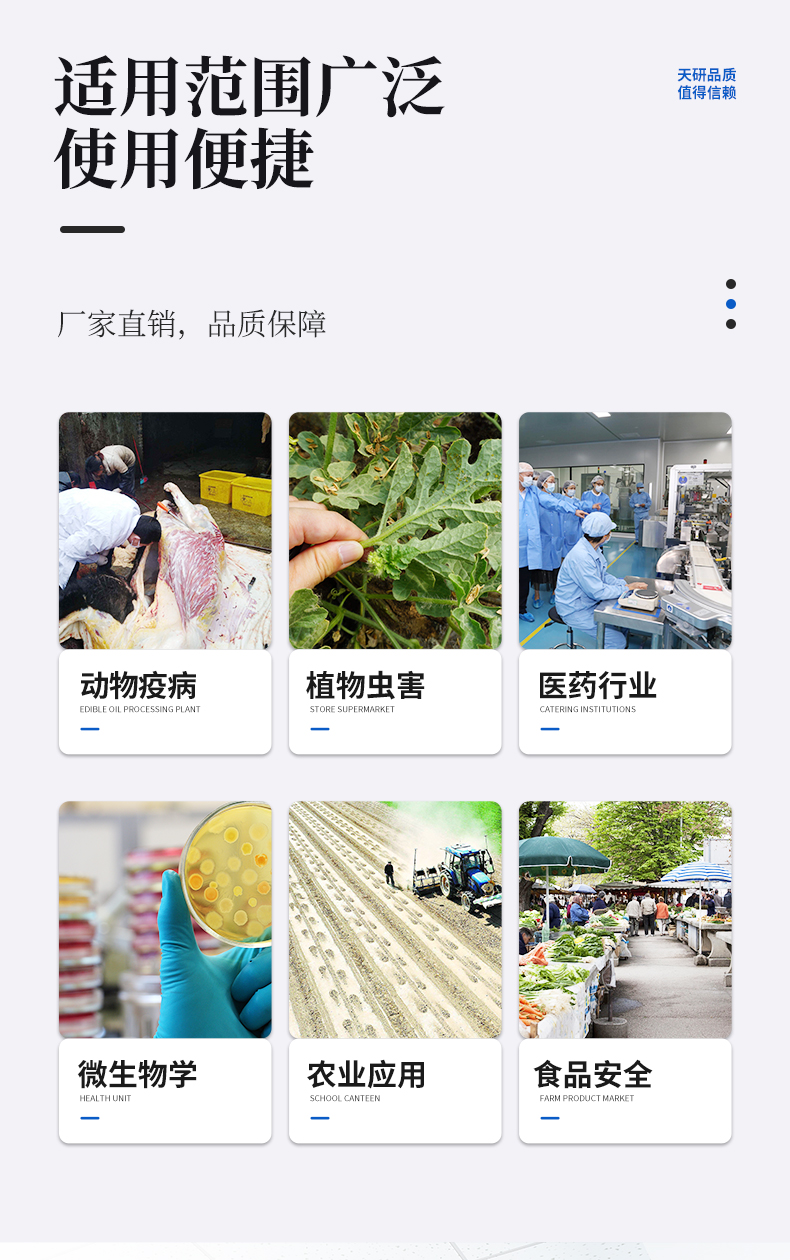 | 瘦肉精激素類(獸藥):鹽酸克倫特羅、沙丁胺醇、萊克多巴胺、己烯雌酚、喹乙醇等 | 抗生素殘留類(獸藥):四環素類、硝基呋喃類、磺胺類、沙星類、喹諾酮類、慶大霉素、鏈霉素、阿莫西林、紅霉素等 | 水產品安全類:孔雀石綠、氯霉素、呋喃妥因代謝、呋喃西林代謝、呋喃它酮代謝、呋喃唑酮代謝等 | 以及病害肉及肉類新鮮度的擴展檢測。 |