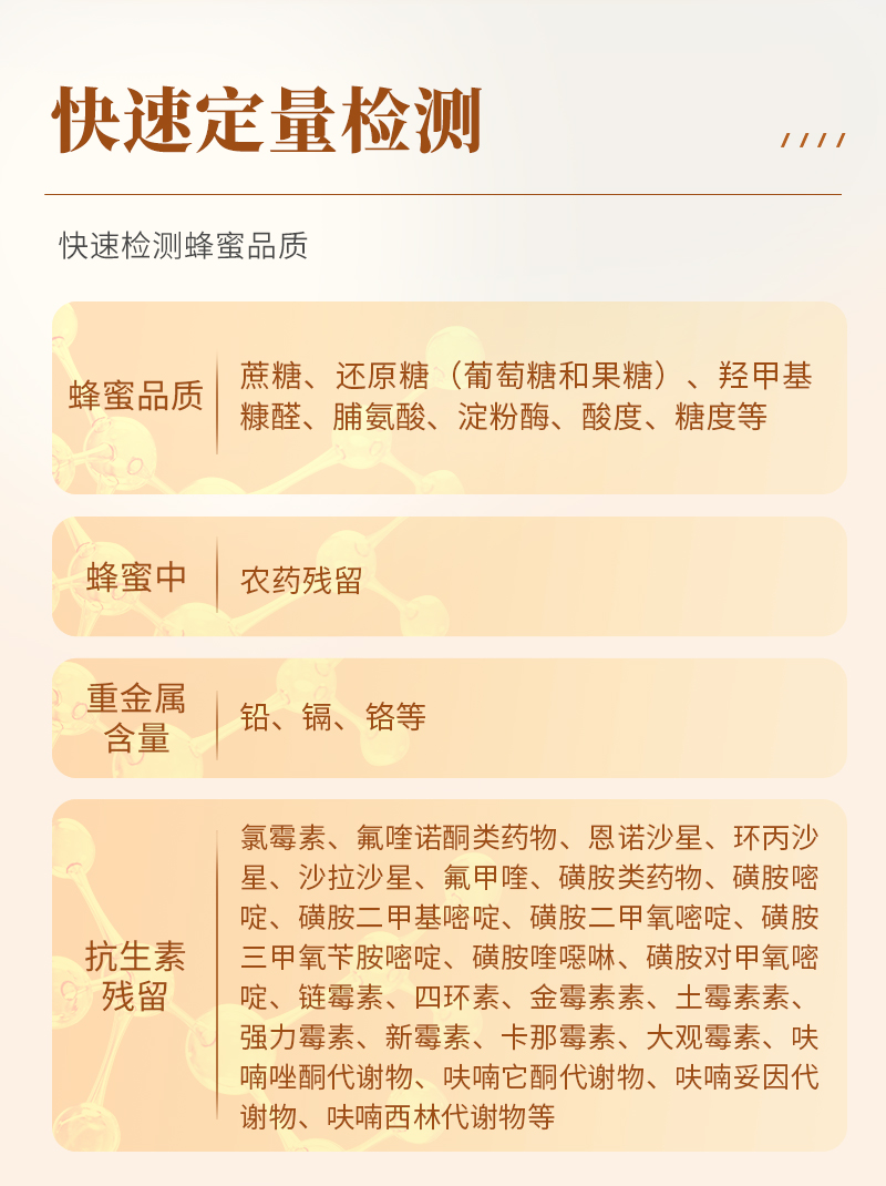 | 食品添加劑:二氧化硫、雙氧水、亞硝酸鹽、硝酸鹽、苯甲酸鈉、山梨酸鉀、糖精鈉、甜蜜素、木耳硫酸鎂等 | 有毒有害物質:甲醛、吊白塊、硼砂、過氧化苯甲酰、溴酸鉀、羅丹明B、三聚氰胺、蘇丹紅、工業堿、尿素、明礬等 | 果蔬:農藥殘留(酶抑制率法) | 病害肉診斷:組胺、揮發性鹽基氮; | 重金屬含量:鉛、鎘、鉻、汞、砷、錫、鎳、鋁等; | 食用油脂: 過氧化值、酸價等 | 瘦肉精激素類(獸藥):鹽酸克倫特羅、沙丁胺醇、萊克多巴胺、己烯雌酚等 | 抗生素殘留類(獸藥):四環素類、硝基呋喃類、磺胺類、β-興奮劑類、沙星類、磺胺類、喹諾酮類,甲砜霉素,氟苯尼考,金剛烷胺、替米考星、慶大霉素、林可霉素、鏈霉素、恩諾沙星、環丙沙星、頭孢啦啶、青霉素、阿莫西林等 | 真菌毒素類:食用油、糧食及飼料中黃曲霉毒素B1、黃曲霉毒素總量,奶中黃曲霉毒素M1、嘔吐毒素、玉米赤霉烯酮、赭曲霉毒素A、T2毒素、伏馬毒素等; | 水酒飲品分析:酒中甲醇、乙醇、乳品及牛奶中蛋白質, | 調味品成分:食醋的總酸、醬油的總酸、芝麻油純度、谷氨酸鈉、醬油氨基酸態氮、食鹽中亞鐵氰化鉀、食鹽中碘等 | 食用色素類:紅色色素(胭脂紅、莧菜紅、赤蘚紅、誘惑紅)、黃色色素(檸檬黃、日落黃)、藍色色素(亮藍)等 | 動物疫病類:禽流感、新城疫、牛羊口蹄疫、牛羊結核病、牛羊包蟲、牛羊布病、小反芻獸、豬藍耳病毒、豬瘟病毒、豬偽狂犬病毒、豬細小、豬圓環、犬細小病毒、犬瘟熱病毒、犬狂犬病毒等; | 蜂蜜成分:果糖和葡萄糖、蔗糖、淀粉酶、酸度等 | 水產品安全類:孔雀石綠、氯霉素、呋喃妥因、呋喃西林、呋喃它酮、呋喃唑酮等 | 蛋類藥物殘留:氯霉素,四環素,磺胺類,喹諾酮類,呋喃西林,呋喃它酮,呋喃妥因,呋喃唑酮,氟苯尼考,阿莫西林、頭孢氨芐、紅霉素、鏈霉素等 |