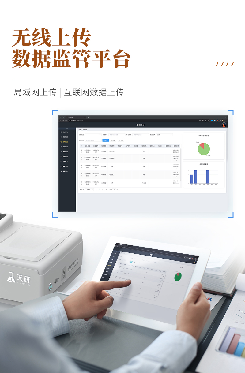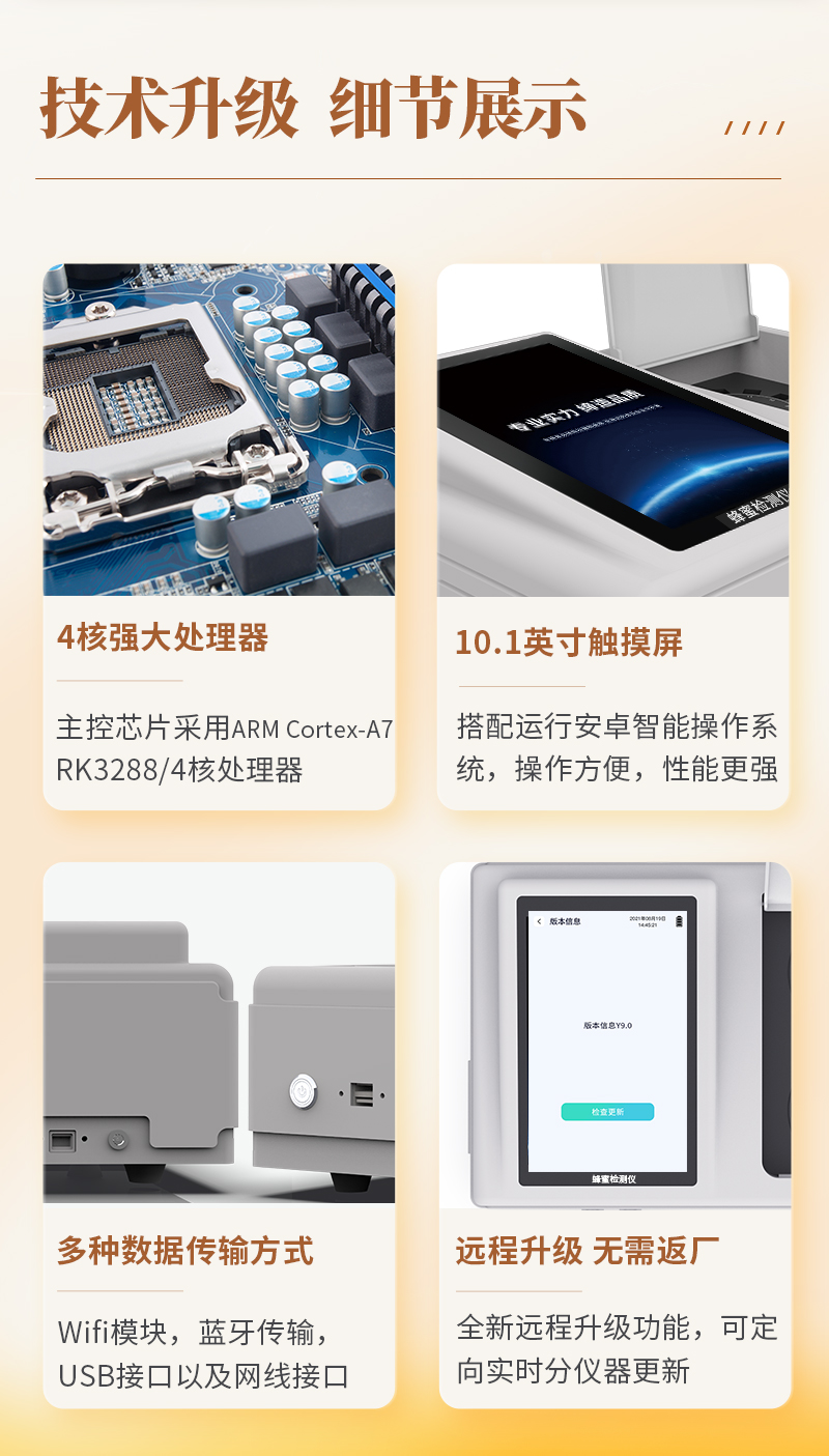 | 儀器采用手提一體化系統檢測技術,將分光光度模塊、膠體金檢測模塊、新型農殘檢測模塊、數字化管理模塊、無線通訊模塊高度集成于一體,支持檢測200種食品安全檢測項目,同時預留升級檢測方法。 | 儀器檢測模塊標準化、智能化,檢測項目可隨意自由組合。檢測箱體內置多個標準檢測單元,檢測模塊可以調整配置。 | 顯示屏幕:儀器采用10.1英寸豎向液晶觸摸屏顯,搭配運行安卓智能操作系統,主控芯片采用ARM Cortex-A7,RK3288/4核處理器,主頻1.88Ghz,操作方便,性能更強。 | 檢測通道:≥12通道;采用精密旋轉比色池設計,使用同芯片同光源校準精度,解決不同光源之間的誤差值,更加準確**。(1-12通道間誤差0.1%,**號:ZL202022821055.2) | 儀器光源:高精度進口四波長冷光源,每個通道均配置 410、520、590、630nm 波長光源,標配**的光路切換裝置,**光路切換功能可實現64波長,并且所有檢測項目可實現所有通道同時檢測。 | 設備可一鍵校準,自動保存校準數據,自動對比校驗,得到精準光源,采用Android SP存儲數據,光源數據永不丟失,方便每一次使用。 | 通訊接口:配備無線通信模塊、4G(APN)通訊模塊、藍牙傳輸,同時具有雙USB接口以及RJ45網線接口,可以多方式實現數據保存及數據傳輸。 | 存儲方式:支持U盤存儲,標準USB接口,免驅動安裝。檢測結果存儲容量20萬條以上,可生成Excel表格進行拷貝,并具有登錄保護功能。 | 智能化操作系統:: ★操作系統:儀器可在同一檢測界面自動對應相關檢測通道,一次性選擇1-12個樣品名稱,無需退出界面,節省操作時間。并可以對每個通道屬性和樣品信息單獨進行編輯,例如送檢單位、人員,檢測人員等,打印時勾選打印顯示。 | ★數據集成系統:設備首頁自動匯總分析檢測數據,包含:周檢測數據、月檢測數據,全部檢測總數量,均包含檢測總數,合格數,不合格數,以及相關柱形分析圖,各項檢測數據一目了然,無需電腦查詢,更加快捷直觀。 | ★數據庫系統:十幾項數據庫分類管理儀器:包含項目類型、項目數據、檢測數據、歷史記錄、國標信息、曲線信息、采樣信息、檢測信息、受檢信息、復核信息、圖表信息、光源校準信息、打印樣式信息、樣品庫信息等等,數據庫之間互相協調聯動保證數據的真實完整性。同時產品數據庫以及歷史檢測記錄支持一鍵檢索功能。 | ★限量規判系統:具有限量查詢、添加物質合規判定系統。檢測出結果后,系統自動調用系統數據庫中相關國標進行比對判定,客觀顯示判定結果是否合格 | ★項目預設系統:儀器具有任務預設模塊,一鍵提前預設,給出方便快捷的新檢測方案,每一個任務分別可以設置不同的樣品、批次、編號、來源、備注、抽樣信息、檢測信息、受檢信息、復核信息等更多信息。樣品送檢時一鍵調取保存信息,并可多次調取,大大提高檢測效率。 | ★數據監管系統:同步對接監管平臺,數據可局域網和互聯網數據上傳,檢測結果可選擇直接傳至食品安全監管平臺。進行區域食品安全監管及大數據分析處理與數據統計,檢測區域食品安全長短期動態,達到食品安全問題預估、預警。 | ★打印系統:內置全新打印機,新創自定義打印方式,可按需靈活勾選控制:產品合格證(國家農業部標準要求),二維碼,抽樣信息、檢測信息,受檢信息、復核信息、抽樣日期、檢測日期等信息的打印。 | 供電模式:儀器交直流兩用,直流12V供電,可連接車載電源,可配6ah大容量充電鋰電池,電量可實時顯示,方便戶外流動測試。 | 膠體金檢測模塊:采用雙通道CMOS成像處理技術及膠體金免疫層析技術,可同時讀取雙膠體金卡數據,自動采集、處理分析,將檢測結果顯示,并可根據參考限值自動判斷檢測結果,可檢測常見的獸藥殘留、生物毒素、抗生素、違禁添加物等。 | ★探測技術:CMOS成像探測; | ★檢測通道:1個通道; | ★檢測方式:消線法和比色法; | ★顯示模式:陰性或陽性; | 曲線形式:軌道式掃描方式,顯示金標卡圖像,實時生成、識別CT曲線圖,無需手動調整,完成檢測后自動退出檢測卡。兼容市場上其他金標卡,使用耗材不受限制。 | 儀器具備遠程升級功能,可定向分客戶分儀器更新,開機后自動更新,并可持續性免費更新系統版本,無需像傳統產品返廠更新,節省時間及人力成本并避免了物流運輸返廠升級導致設備損壞的潛在風險。 |