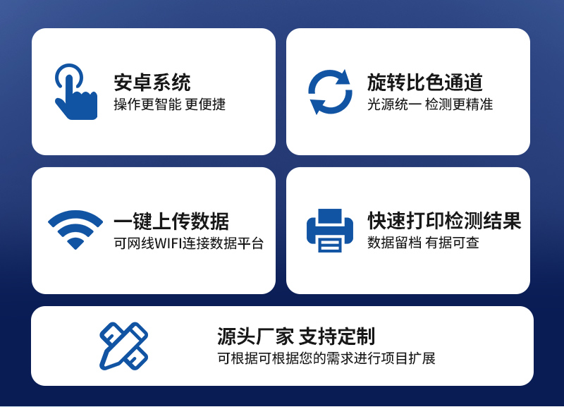 | 機器采用全新安卓智能系統,主控芯片采用 ARM Cortex-A7,RK3288/4核處理器,主頻1.88Ghz,運轉速度更快速,穩定性更強。 | 創新檢測模式: *儀器采用精密旋轉比色池設計,使用光源一致,可以解決各通道間由于光源誤差帶來的檢測結果誤差問題,檢測結果更加精準。 *儀器具有自動識別比色皿檢測功能,即:將樣品比色皿放入儀器后,點擊樣品檢測,儀器自動識別比色皿進行通道檢測。 | 供電方式:交直流兩用,直流 12V 供電,可連接車載電源,可配 6ah 大容量充電鋰電池,方便戶外流動測試。 | 顯示方式:7英寸液晶觸摸屏顯示,人性化中文操作界面,讀數直觀、簡單。 | 檢測通道:8個檢測通道,可以同時測試多個樣品,循環檢測,即放即檢,每個樣品由程序控制分別獨立工作,不會互相干擾。 | 高精光源系統: ①儀器光源采用進口超高亮發光二極管,光源亮度可以自動調節與校準 ②智能恒流穩壓,光強自動校準,長時間連續工作光源無溫漂現象。 | 智能操作分析系統: ①儀器具有100多種蔬菜名稱菜單庫,分類管理,并可按需添加或刪除、編輯蔬菜名稱;可在同一檢測界面自動對應相關檢測通道一次性選擇1-24個樣品名稱,無需退出界面,節省操作時間。 ②內置新國家限量標準,與所測結果進行現場比對,并持續更新標準。 | 完善的配套硬件: ①采用串口5v打印機,可選擇手動打印或者自動打印,三分鐘出打印結果,打印格式為檢測人姓名、吸光度差值、檢測時間、檢測機構、樣品名稱及結果判定。 ②儀器具有無線上傳模塊,檢測結果可批量打印,批量上傳。 | 數據調用: ①儀器可存儲20萬條檢測結果, ②檢測結果為Excel表格,方便后期進行數據分析與匯總報告 ③儀器采用USB2.0接口設計,支持 U 盤存儲,方便數據的存貯和移動,并可隨時與計算機直接相連,實現數據查詢、瀏覽、分析、統計、打印等。 | 后期產品固件可升級。 | 安全證書,放心保障:儀器具有中國計量科學研究院校準證書,**認證,使用放心。 | 機箱采用工業級ABS工程塑料箱,方便攜帶,穩固耐用,便于流動測試。 |