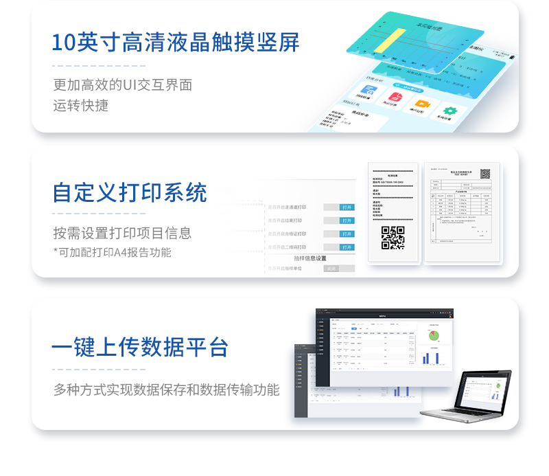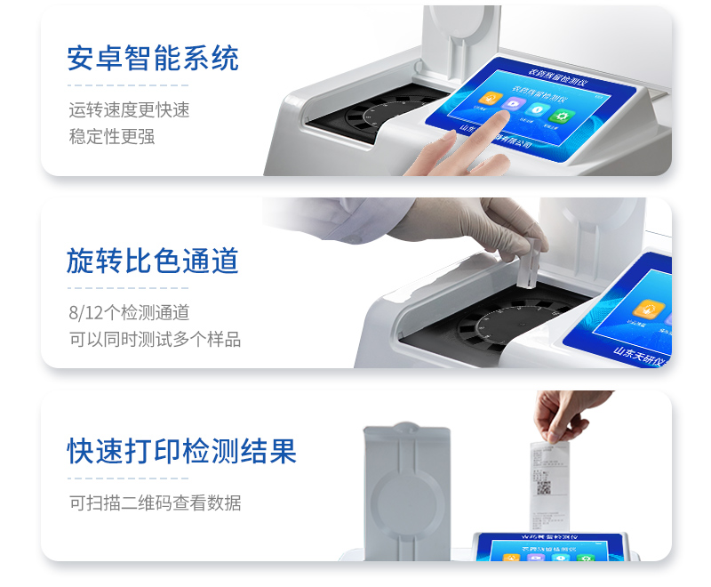 | 安卓智能操作系統,采用更加**和人性化操作,儀器具有無線聯網上傳功能,快速上傳數據,進行數據統計和分析。 | 智能化程度高,儀器具有自檢功能:具有開機自檢和調零功能,具有自動檢測重復性功能;同時,檢測完成可自動打印檢測報告和二維碼。手機掃碼可顯示出詳細檢測信息。 | 儀器帶有監管平臺,數據可局域網和互聯網數據上傳,檢測結果直接傳至食品安全監管平臺。進行區域食品安全監管及大數據分析處理與數據統計,檢測區域食品安全長短期動態,達到食品安全問題預估、預警 。 | 樣品處理簡單省力,整體操作快速、安全、便捷。 | 儀器具有自身保護功能,可設置用戶名及密碼,防止非工作人員操作等。 | 內置強大的數據庫,可在儀器上直接選擇樣品名稱、檢測指標、送檢單位等信息,也可在儀器上直接編輯錄入樣品名稱、檢測指標、送檢單位等信息并保存進樣品數據庫,方便后期操作調取使用。 | 儀器具有重新校準、鎖定、恢復出廠設置功能。 |