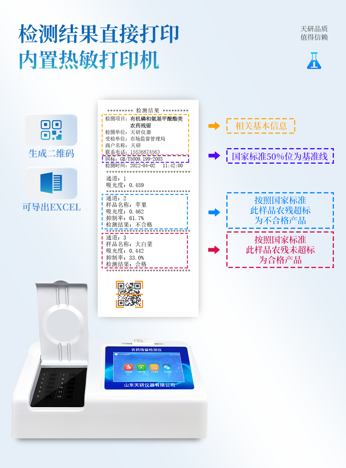 | 乙酰膽堿酯酶和丁酰膽堿酯酶試劑均可以使用,符合國家標準和農業部標準的要求。 | 自動判斷樣品是否合格,檢測結果更加直觀。 | 儀器具有100多種蔬菜名稱菜單庫,分類管理,并可按需添加或刪除蔬菜名,編輯蔬菜名稱,可直接打印出蔬菜名稱。 | 檢測通道:16個檢測通道,可以同時測試多個樣品,循環檢測,即放即檢,每個樣品由程序控制分別獨立工作,不會互相干擾。 | 智能操作系統,采用更加人性化操作,主控采用多核處理器,主頻1.88Ghz,運轉速度更快速,穩定性更強。 | 顯示方式:7英寸高靈敏真彩觸摸屏顯示,人性化中文操作界面,讀數直觀、簡單。 | 打印機采用串口5v打印,可選擇手動打印或者自動打印,三分鐘出打印結果,打印格式為檢測人姓名、吸光度差值、檢測時間、檢測機構、樣品名稱及結果判定。 | 光源采用進口超高亮發光二極管,具有低功耗、高精度、穩定性強、光源可控可以關掉不使用的光源,響應速度快等優點。 | 智能恒流穩壓,光強自動校準,長時間連續工作光源無溫漂現象。 | 儀器具有GPRS遠傳功能,可插手機卡實現數據遠傳平臺,wifi聯網功能,可將數據快速上傳電腦,進行數據管理與統計。 | 采用USB2.0接口設計,方便數據的存貯和移動,并可隨時與計算機直接相連,并且可用計算機控制儀器。實現數據查詢、瀏覽、分析、統計、打印等。 | 智能化程度高,儀器具有自檢功能:具有開機自檢和調零功能,具有自動檢測重復性功能 | 儀器具有自身保護功能,可設置用戶名及密碼,防止非工作人員操作等。 | 采用DC12v直流供電,安全系統更高,并且配備6A鋰電池充電器。 | 儀器具有重新校準、鎖定、恢復出廠設置功能。 |
