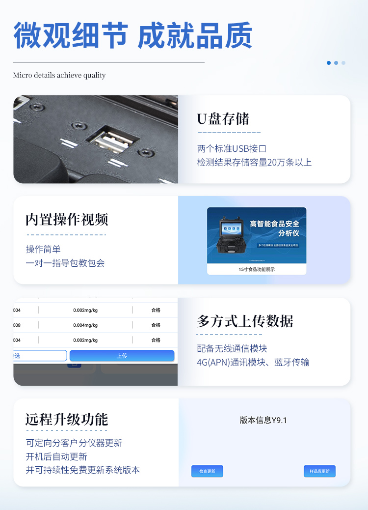 儀器采用手提一體化系統(tǒng)檢測(cè)技術(shù),將分光光度模塊、膠體金檢測(cè)模塊、新型農(nóng)殘檢測(cè)模塊、數(shù)字化管理模塊、無(wú)線通訊模塊高度集成于一體,支持檢測(cè)200種食品安全檢測(cè)項(xiàng)目,同時(shí)預(yù)留升級(jí)檢測(cè)方法。儀器檢測(cè)模塊標(biāo)準(zhǔn)化、智能化,檢測(cè)項(xiàng)目可隨意自由組合。檢測(cè)箱體內(nèi)置多個(gè)標(biāo)準(zhǔn)檢測(cè)單元,檢測(cè)模塊可以調(diào)整配置。顯示屏幕:儀器采用10.1英寸豎向液晶觸摸屏顯,搭配運(yùn)行安卓智能操作系統(tǒng),主控芯片采用ARM Cortex-A7,RK3288/4核處理器,主頻1.88Ghz,操作方便,性能更強(qiáng)。檢測(cè)通道:≥12通道;采用精密旋轉(zhuǎn)比色池設(shè)計(jì),使用同芯片同光源校準(zhǔn)精度,解決不同光源之間的誤差值,更加準(zhǔn)確**。(1-12通道間誤差0.1%,**號(hào):ZL202022821055.2)儀器光源:高精度進(jìn)口四波長(zhǎng)冷光源,每個(gè)通道均配置 410、520、590、630nm 波長(zhǎng)光源,標(biāo)配**的光路切換裝置,**光路切換功能可實(shí)現(xiàn)64波長(zhǎng),并且所有檢測(cè)項(xiàng)目可實(shí)現(xiàn)所有通道同時(shí)檢測(cè)。設(shè)備可一鍵校準(zhǔn),自動(dòng)保存校準(zhǔn)數(shù)據(jù),自動(dòng)對(duì)比校驗(yàn),得到精準(zhǔn)光源,采用Android SP存儲(chǔ)數(shù)據(jù),光源數(shù)據(jù)永不丟失,方便每一次使用。通訊接口:配備無(wú)線通信模塊、4G(APN)通訊模塊、藍(lán)牙傳輸,同時(shí)具有雙USB接口以及RJ45網(wǎng)線接口,可以多方式實(shí)現(xiàn)數(shù)據(jù)保存及數(shù)據(jù)傳輸。存儲(chǔ)方式:支持U盤存儲(chǔ),標(biāo)準(zhǔn)USB接口,免驅(qū)動(dòng)安裝。檢測(cè)結(jié)果存儲(chǔ)容量20萬(wàn)條以上,可生成Excel表格進(jìn)行拷貝,并具有登錄保護(hù)功能。智能化操作系統(tǒng):: ★操作系統(tǒng):儀器可在同一檢測(cè)界面自動(dòng)對(duì)應(yīng)相關(guān)檢測(cè)通道,一次性選擇1-12個(gè)樣品名稱,無(wú)需退出界面,節(jié)省操作時(shí)間。并可以對(duì)每個(gè)通道屬性和樣品信息單獨(dú)進(jìn)行編輯,例如送檢單位、人員,檢測(cè)人員等,打印時(shí)勾選打印顯示。★數(shù)據(jù)集成系統(tǒng):設(shè)備首頁(yè)自動(dòng)匯總分析檢測(cè)數(shù)據(jù),包含:周檢測(cè)數(shù)據(jù)、月檢測(cè)數(shù)據(jù),全部檢測(cè)總數(shù)量,均包含檢測(cè)總數(shù),合格數(shù),不合格數(shù),以及相關(guān)柱形分析圖,各項(xiàng)檢測(cè)數(shù)據(jù)一目了然,無(wú)需電腦查詢,更加快捷直觀。★數(shù)據(jù)庫(kù)系統(tǒng):十幾項(xiàng)數(shù)據(jù)庫(kù)分類管理儀器:包含項(xiàng)目類型、項(xiàng)目數(shù)據(jù)、檢測(cè)數(shù)據(jù)、歷史記錄、國(guó)標(biāo)信息、曲線信息、采樣信息、檢測(cè)信息、受檢信息、復(fù)核信息、圖表信息、光源校準(zhǔn)信息、打印樣式信息、樣品庫(kù)信息等等,數(shù)據(jù)庫(kù)之間互相協(xié)調(diào)聯(lián)動(dòng)保證數(shù)據(jù)的真實(shí)完整性。同時(shí)產(chǎn)品數(shù)據(jù)庫(kù)以及歷史檢測(cè)記錄支持一鍵檢索功能。★限量規(guī)判系統(tǒng):具有限量查詢、添加物質(zhì)合規(guī)判定系統(tǒng)。檢測(cè)出結(jié)果后,系統(tǒng)自動(dòng)調(diào)用系統(tǒng)數(shù)據(jù)庫(kù)中相關(guān)國(guó)標(biāo)進(jìn)行比對(duì)判定,客觀顯示判定結(jié)果是否合格★項(xiàng)目預(yù)設(shè)系統(tǒng):儀器具有任務(wù)預(yù)設(shè)模塊,一鍵提前預(yù)設(shè),給出方便快捷的新檢測(cè)方案,每一個(gè)任務(wù)分別可以設(shè)置不同的樣品、批次、編號(hào)、來(lái)源、備注、抽樣信息、檢測(cè)信息、受檢信息、復(fù)核信息等更多信息。樣品送檢時(shí)一鍵調(diào)取保存信息,并可多次調(diào)取,大大提高檢測(cè)效率。★數(shù)據(jù)監(jiān)管系統(tǒng):同步對(duì)接監(jiān)管平臺(tái),數(shù)據(jù)可局域網(wǎng)和互聯(lián)網(wǎng)數(shù)據(jù)上傳,檢測(cè)結(jié)果可選擇直接傳至食品安全監(jiān)管平臺(tái)。進(jìn)行區(qū)域食品安全監(jiān)管及大數(shù)據(jù)分析處理與數(shù)據(jù)統(tǒng)計(jì),檢測(cè)區(qū)域食品安全長(zhǎng)短期動(dòng)態(tài),達(dá)到食品安全問題預(yù)估、預(yù)警。★打印系統(tǒng):內(nèi)置全新打印機(jī),新創(chuàng)自定義打印方式,可按需靈活勾選控制:產(chǎn)品合格證(國(guó)家農(nóng)業(yè)部標(biāo)準(zhǔn)要求),二維碼,抽樣信息、檢測(cè)信息,受檢信息、復(fù)核信息、抽樣日期、檢測(cè)日期等信息的打印。供電模式:儀器交直流兩用,直流12V供電,可連接車載電源,可配6ah大容量充電鋰電池,電量可實(shí)時(shí)顯示,方便戶外流動(dòng)測(cè)試。膠體金檢測(cè)模塊:采用雙通道CMOS成像處理技術(shù)及膠體金免疫層析技術(shù),可同時(shí)讀取雙膠體金卡數(shù)據(jù),自動(dòng)采集、處理分析,將檢測(cè)結(jié)果顯示,并可根據(jù)參考限值自動(dòng)判斷檢測(cè)結(jié)果,可檢測(cè)常見的獸藥殘留、生物毒素、抗生素、違禁添加物等。★探測(cè)技術(shù):CMOS成像探測(cè);★檢測(cè)通道:1個(gè)通道;★檢測(cè)方式:消線法和比色法;★顯示模式:陰性或陽(yáng)性;曲線形式:軌道式掃描方式,顯