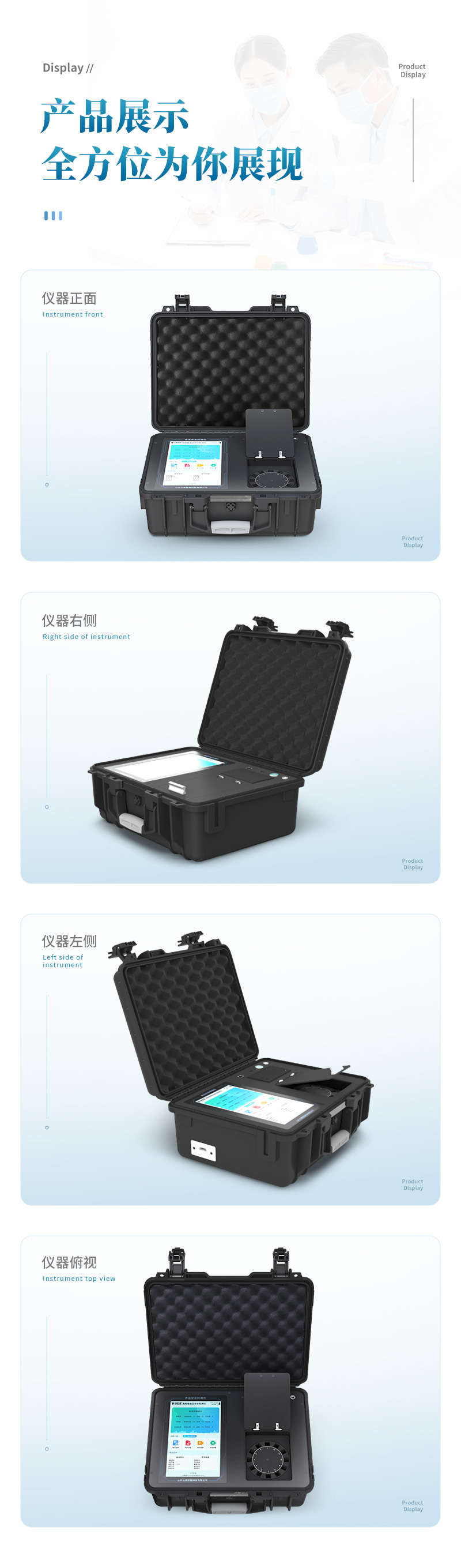 | 儀器采用手提式一體化系統(tǒng)檢測技術(shù),將分光光度模塊、膠體金檢測模塊、新型農(nóng)殘檢測模塊、數(shù)字化管理模塊、無線通訊模塊高度集成于一體,支持檢測200種食品安全檢測項(xiàng)目,同時(shí)預(yù)留升級檢測方法。 | 儀器檢測模塊標(biāo)準(zhǔn)化、智能化,檢測項(xiàng)目可隨意自由組合。檢測箱體內(nèi)置多個(gè)標(biāo)準(zhǔn)檢測單元,檢測模塊可以調(diào)整配置。 | 顯示屏幕:儀器采用10.1英寸豎向液晶觸摸屏顯,搭配運(yùn)行安卓智能操作系統(tǒng),主控芯片采用ARM Cortex-A7,RK3288/4核處理器,主頻1.88Ghz,操作方便,性能更強(qiáng)。 | 檢測通道:≥12通道;采用精密旋轉(zhuǎn)比色池設(shè)計(jì),使用同芯片同光源校準(zhǔn)精度,解決不同光源之間的誤差值,更加準(zhǔn)確**。(1-12通道間誤差0.1%,**號:ZL202022821055.2) | 儀器光源:高精度進(jìn)口四波長冷光源,每個(gè)通道均配置 410、520、590、630nm 波長光源,標(biāo)配**的光路切換裝置,**光路切換功能可實(shí)現(xiàn)64波長,并且所有檢測項(xiàng)目可實(shí)現(xiàn)所有通道同時(shí)檢測。 | 設(shè)備可一鍵校準(zhǔn),自動(dòng)保存校準(zhǔn)數(shù)據(jù),自動(dòng)對比校驗(yàn),得到精準(zhǔn)光源,采用Android SP存儲數(shù)據(jù),光源數(shù)據(jù)永不丟失,方便每一次使用。 | 通訊接口:配備無線通信模塊、4G(APN)通訊模塊、藍(lán)牙傳輸,同時(shí)具有雙USB接口以及RJ45網(wǎng)線接口,可以多方式實(shí)現(xiàn)數(shù)據(jù)保存及數(shù)據(jù)傳輸 | 存儲方式:支持U盤存儲,標(biāo)準(zhǔn)USB接口,免驅(qū)動(dòng)安裝。檢測結(jié)果存儲容量20萬條以上,可生成Excel表格進(jìn)行拷貝,并具有登錄保護(hù)功能。 | 智能化操作系統(tǒng): | 1)操作系統(tǒng):儀器可在同一檢測界面自動(dòng)對應(yīng)相關(guān)檢測通道,一次性選擇1-12個(gè)樣品名稱,無需退出界面,節(jié)省操作時(shí)間。并可以對每個(gè)通道屬性和樣品信息單獨(dú)進(jìn)行編輯,例如送檢單位、人員,檢測人員等,打印時(shí)勾選打印顯示。 | 2)數(shù)據(jù)集成系統(tǒng):設(shè)備首頁自動(dòng)匯總分析檢測數(shù)據(jù),包含:周檢測數(shù)據(jù)、月檢測數(shù)據(jù),全部檢測總數(shù)量,均包含檢測總數(shù),合格數(shù),不合格數(shù),以及相關(guān)柱形分析圖,各項(xiàng)檢測數(shù)據(jù)一目了然,無需電腦查詢,更加快捷直觀。 | 3)數(shù)據(jù)庫系統(tǒng):十幾項(xiàng)數(shù)據(jù)庫分類管理儀器:包含項(xiàng)目類型、項(xiàng)目數(shù)據(jù)、檢測數(shù)據(jù)、歷史記錄、國標(biāo)信息、曲線信息、采樣信息、檢測信息、受檢信息、復(fù)核信息、圖表信息、光源校準(zhǔn)信息、打印樣式信息、樣品庫信息等等,數(shù)據(jù)庫之間互相協(xié)調(diào)聯(lián)動(dòng)保證數(shù)據(jù)的真實(shí)完整性。同時(shí)產(chǎn)品數(shù)據(jù)庫以及歷史檢測記錄支持一鍵檢索功能。 | 4)限量規(guī)判系統(tǒng):具有限量查詢、添加物質(zhì)合規(guī)判定系統(tǒng)。檢測出結(jié)果后,系統(tǒng)自動(dòng)調(diào)用系統(tǒng)數(shù)據(jù)庫中相關(guān)國標(biāo)進(jìn)行比對判定,客觀顯示判定結(jié)果是否合格。 | 5)項(xiàng)目預(yù)設(shè)系統(tǒng):儀器具有任務(wù)預(yù)設(shè)模塊,一鍵提前預(yù)設(shè),給出方便快捷的新檢測方案,每一個(gè)任務(wù)分別可以設(shè)置不同的樣品、批次、編號、來源、備注、抽樣信息、檢測信息、受檢信息、復(fù)核信息等更多信息。樣品送檢時(shí)一鍵調(diào)取保存信息,并可多次調(diào)取,大大提高檢測效率。 | 6)數(shù)據(jù)監(jiān)管系統(tǒng):同步對接監(jiān)管平臺,數(shù)據(jù)可局域網(wǎng)和互聯(lián)網(wǎng)數(shù)據(jù)上傳,檢測結(jié)果可選擇直接傳至食品安全監(jiān)管平臺。進(jìn)行區(qū)域食品安全監(jiān)管及大數(shù)據(jù)分析處理與數(shù)據(jù)統(tǒng)計(jì),檢測區(qū)域食品安全長短期動(dòng)態(tài),達(dá)到食品安全問題預(yù)估、預(yù)警。 | 7)打印系統(tǒng):內(nèi)置全新打印機(jī),新創(chuàng)自定義打印方式,可按需靈活勾選控制:產(chǎn)品合格證(國家農(nóng)業(yè)部標(biāo)準(zhǔn)要求),二維碼,抽樣信息、檢測信息,受檢信息、復(fù)核信息、抽樣日期、檢測日期等信息的打印。 | 供電模式:儀器交直流兩用,直流12V供電,可連接車載電源,可配6ah大容量充電鋰電池,電量可實(shí)時(shí)顯示,方便戶外流動(dòng)測試。 | 膠體金檢測模塊:采用雙通道CMOS成像處理技術(shù)及膠體金免疫層析技術(shù),可同時(shí)讀取雙膠體金卡數(shù)據(jù),自動(dòng)采集、處理分析,將檢測結(jié)果顯示,并可根據(jù)參考限值自動(dòng)判斷檢測結(jié)果,可檢測常見的獸藥殘留、生物毒素、抗生素、違禁添加物等。 | 1)探測技術(shù):CMOS成像探測; | 2)檢測通道:1個(gè)通道; | 3)檢測方式:消線法和比色法; | 4)顯示模式:陰性或陽性; | 5)曲線形式:軌道式掃描方式,顯示金標(biāo)卡圖像,實(shí)時(shí)生成、識別CT曲線圖,無需手動(dòng)調(diào)整,完成檢測后自動(dòng)退出檢測卡。兼容市場上其他金標(biāo)卡,使用耗材不受限制。 | 儀器加入遠(yuǎn)程升級功能,可定向分客戶分儀器更新,開機(jī)后自動(dòng)更新,客戶無需任何操作,即可升級全新
