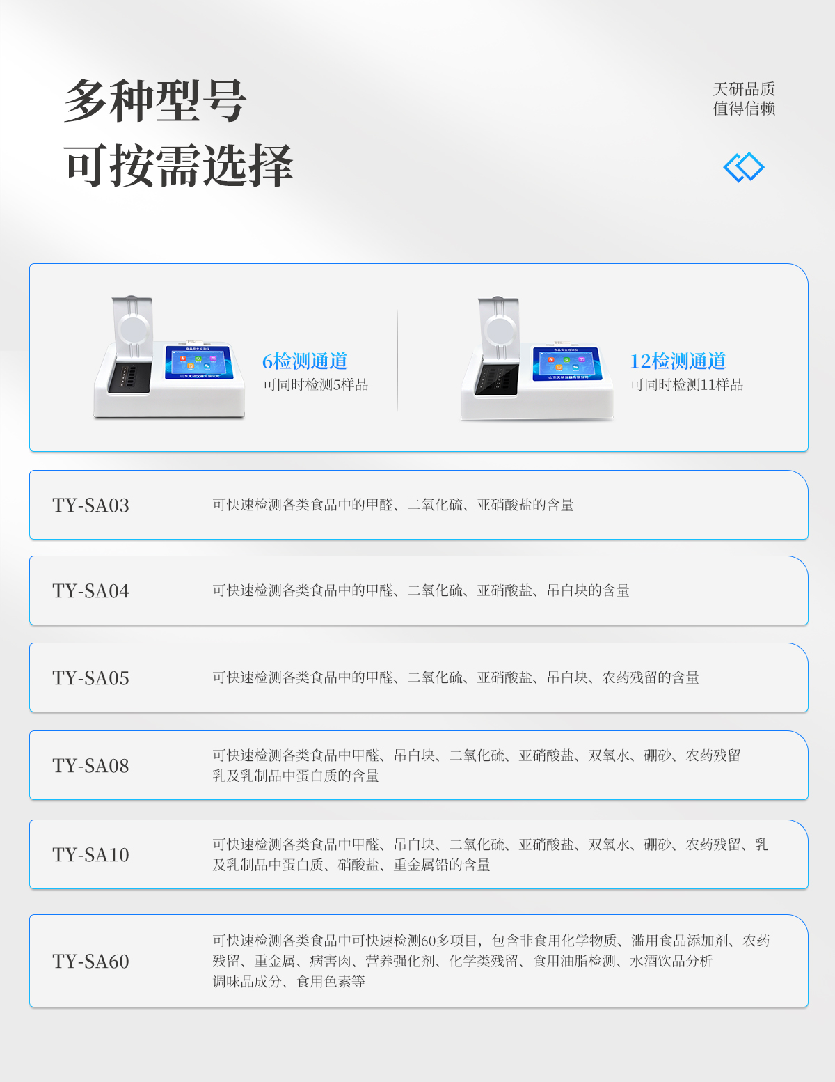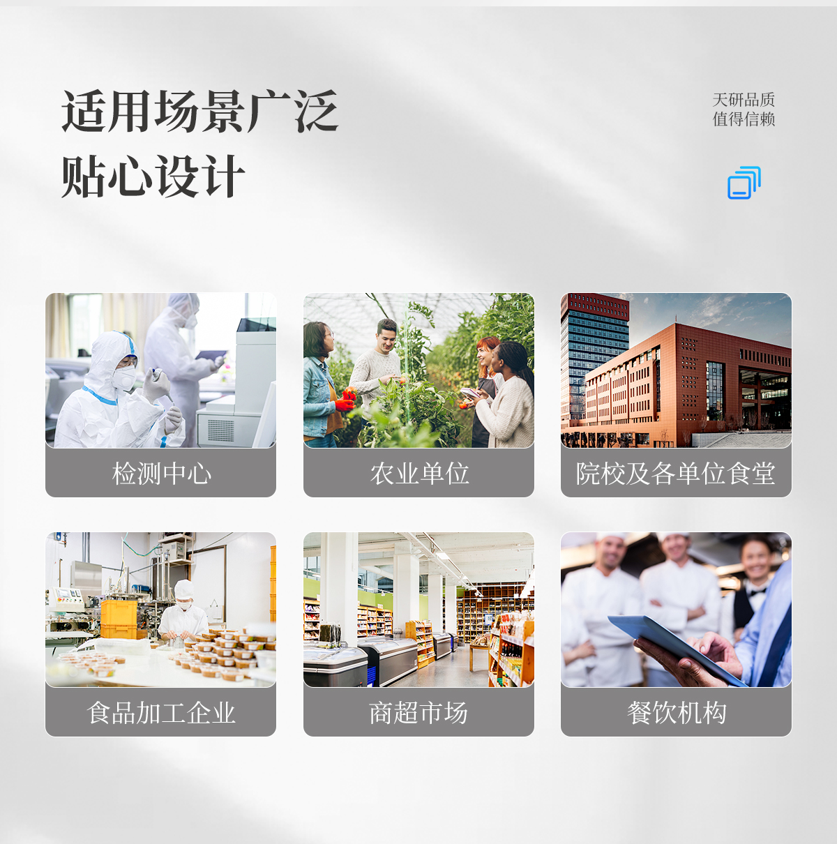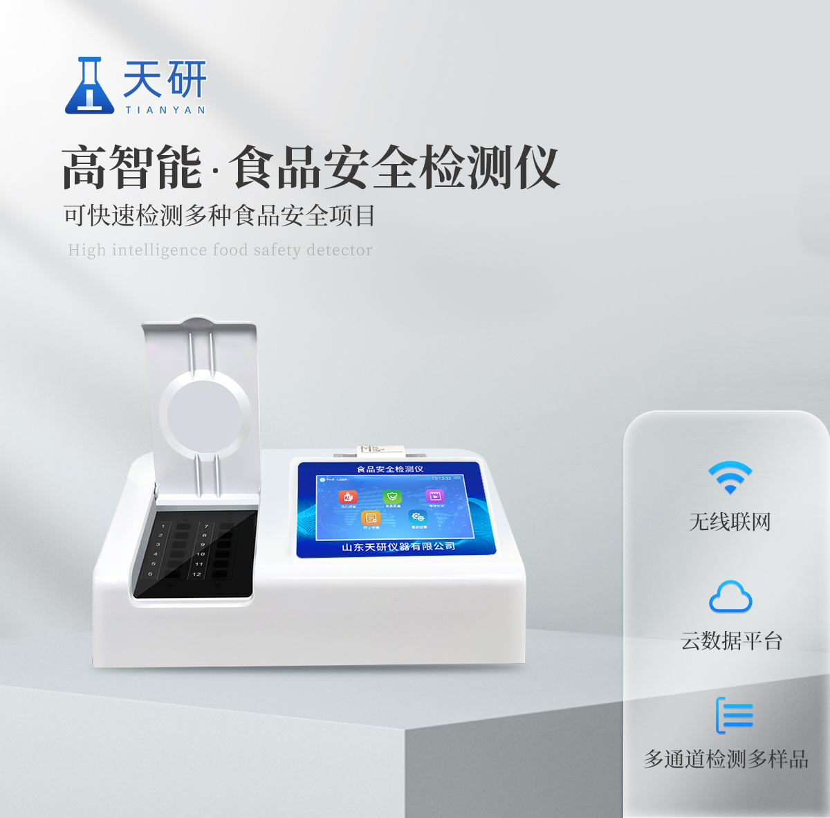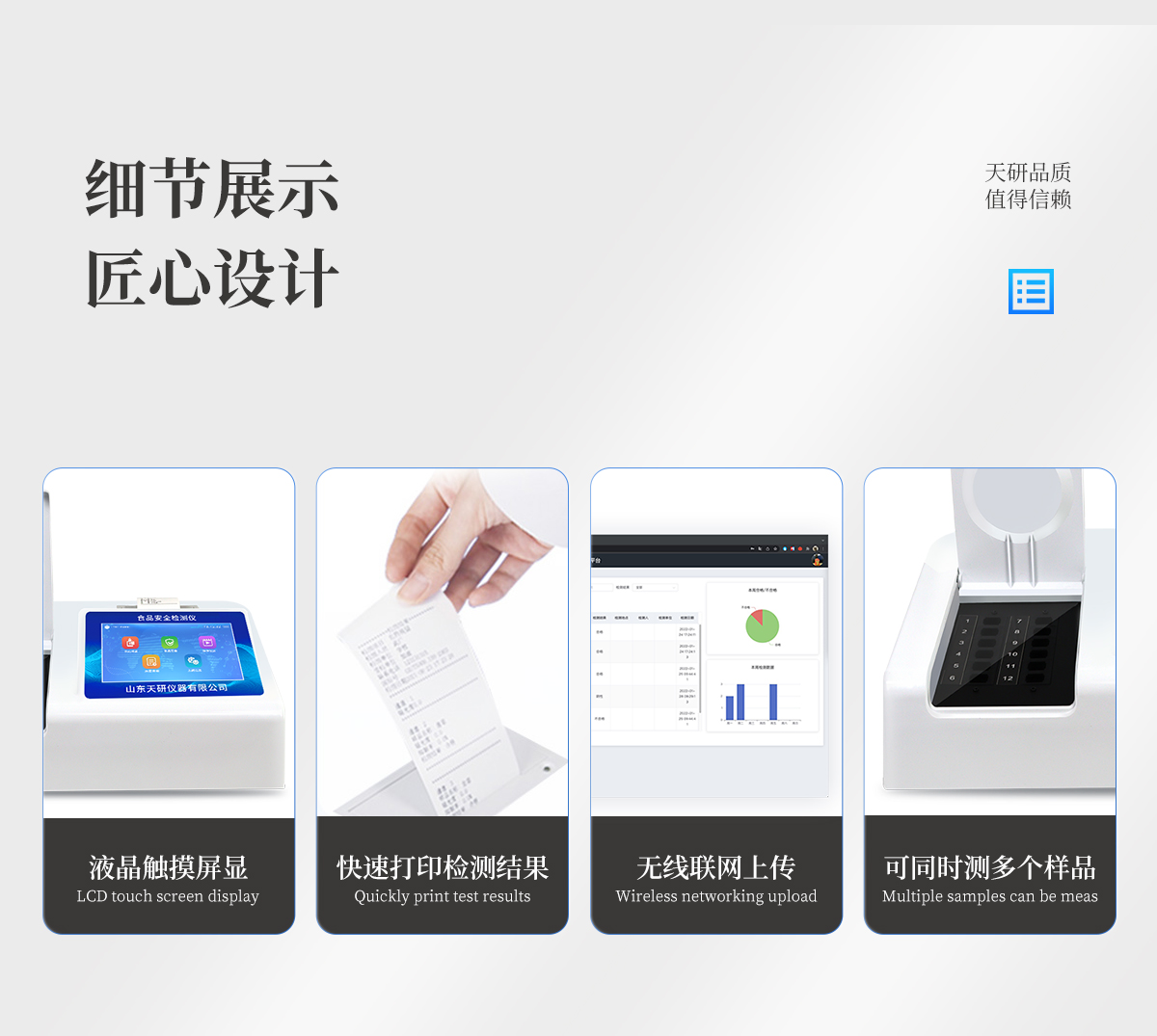 | 安卓智能操作系統,采用更加**UI交互界面,儀器具有wifi聯網上傳、4G聯網傳輸、GPRS無線遠傳、網線連接功能,快速批量上傳數據。 | 智能化程度高,儀器具有自檢功能:具有開機自檢和調零功能,具有自動檢測重復性功能。 | 新一代高速熱敏打印機,檢測完成可自動打印或批量打印檢測報告和二維碼。 | 儀器帶有監管平臺,數據可局域網和互聯網數據上傳,檢測結果直接傳至食品安全監管平臺。進行區域食品安全監管及大數據分析處理與數據統計,檢測區域食品安全長短期動態,達到食品安全問題預估、預警 | 一體化主機,包含光電比色檢測模塊、膠體金免疫層析檢測模塊。 | 一體化便攜式快檢設備,滿足現場及流動檢測使用需求,能夠在同一軟件下實現所有檢測項目的檢測,并可通過同一窗口直觀顯示檢測結果。 | 膠體金模塊檢測方式:軌道式自動傳輸掃描,檢測完成后自動退出檢測卡。 | CT線自動識別,無需手動調整。 | 儀器具有多品類多種類樣品菜單庫,可靈活選擇檢測樣品,不同的檢測通道可同時檢測不同的樣品項目。也可在儀器上直接編輯錄入樣品名稱、檢測指標、送檢單位等信息并保存進樣品數據庫。 | 儀器內置操作視頻,是您身邊的化驗指導專家。 | 樣品處理簡單省力,整體操作快速、安全、便捷。 | 儀器具有自身保護功能,可設置用戶名及密碼,防止非工作人員操作等。 | 高靈敏度,高檢測精度,高重復性精度,掃描式高精度光學傳感器。 | 儀器具有重新校準、鎖定、恢復出廠設置功能。 | 結果判定線可修改,對照值標定值可保存,斷電不丟失數據。 | 兼容市場上所有的膠體金卡,使用耗材不受限制,極大增強用戶使用體驗。 |