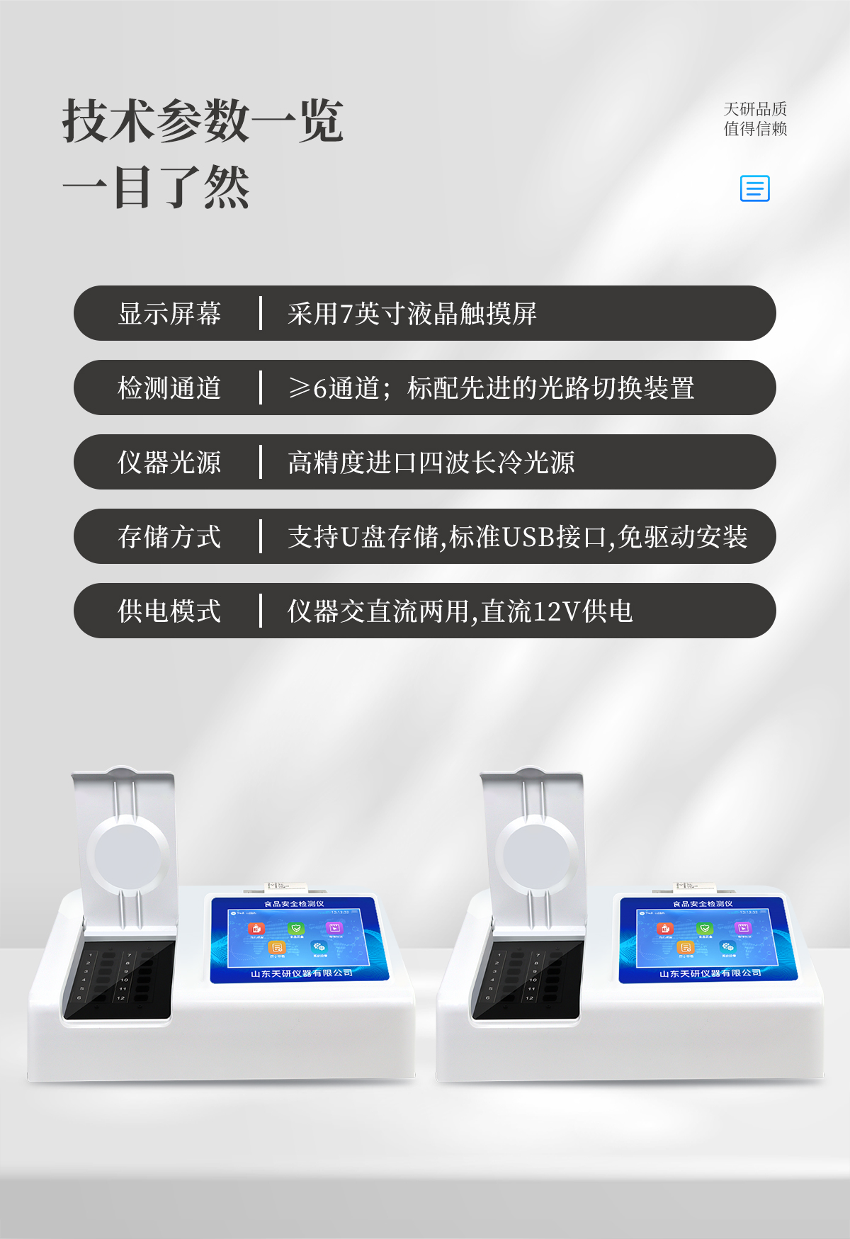 | 主控芯片采用ARM Cortex-A7,RK3288/4核處理器,主頻1.88Ghz,運轉速度更快速,穩定性更強。 | 顯示方式:7英寸液晶觸摸屏顯示,人性化中文操作界面,讀數直觀、簡單。 | 交直流兩用,直流12V供電,也可連接車載電源,可加配6ah大容量充電鋰電池,方便戶外流動測試。 | 四波長冷光源,12個檢測通道,每個通道均配置410、520、590、630nm波長光源,標配**的光路切換裝置,專業光路切換功能可實現*多64波長,并且所有檢測項目可實現所有通道同時檢測 | 光源亮度自動調節與校準 | 智能恒流穩壓,光強自動校準,長時間連續工作光源無溫漂現象。 | 內置新國家限量標準,與所測結果進行現場比對,并持續更新標準。 | 不間斷進樣,連續檢測 | 樣本編號自動累加。 | 檢測結果為Excel表格,連接電腦即可拷貝。 | 檢測結果存儲容量20萬條 | 支持U盤存儲,標準USB接口,免驅動安裝。 | 檢測項目可擴充,固件可升級 | 儀器尺寸:43×35×20cm, 主機凈重:5.2g |