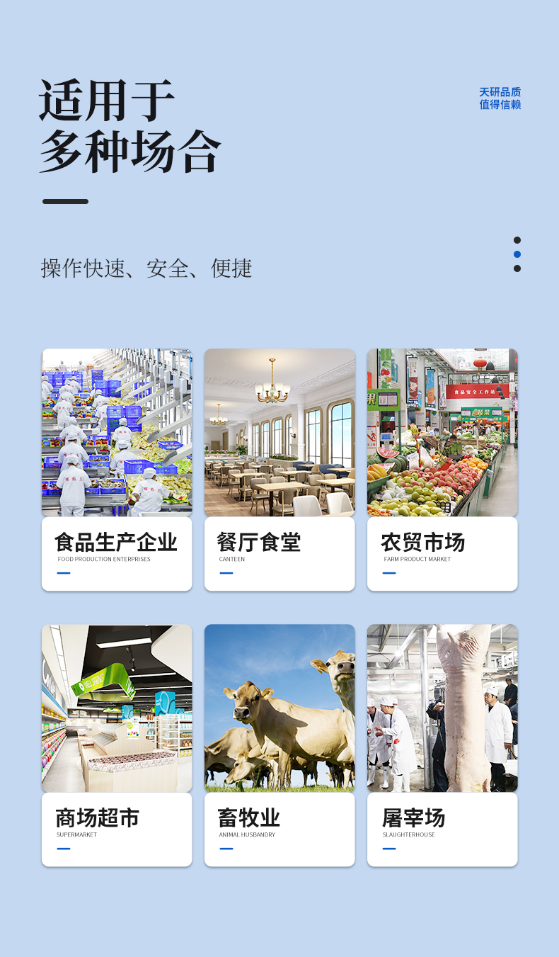 | 瘦肉精激素類(獸藥):鹽酸克倫特羅、沙丁胺醇、萊克多巴胺、己烯雌酚、喹乙醇等 | 抗生素殘留類(獸藥):四環素類、硝基呋喃類、磺胺類、沙星類、喹諾酮類、慶大霉素、鏈霉素、阿莫西林、紅霉素等 | 水產品安全類:孔雀石綠、氯霉素、呋喃妥因代謝、呋喃西林代謝、呋喃它酮代謝、呋喃唑酮代謝等 | 以及病害肉及肉類新鮮度的擴展檢測。 |