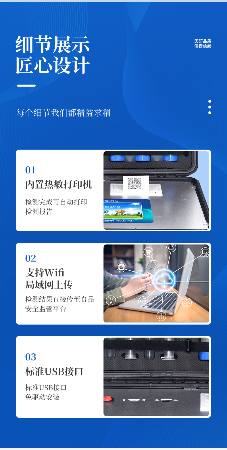 | 安卓智能操作系統,采用更加**UI交互界面,儀器具有wifi聯網上傳、4G聯網傳輸、GPRS無線遠傳、網線連接功能,快速批量上傳數據。 | 智能化程度高,儀器具有自檢功能:具有開機自檢和調零功能,具有自動檢測重復性功能。 | 新一代高速熱敏打印機,檢測完成可自動打印檢測報告和二維碼。 | 儀器帶有監管平臺,數據可局域網和互聯網數據上傳,檢測結果直接傳至食品安全監管平臺。進行區域食品安全監管及大數據分析處理與數據統計,檢測區域食品安全長短期動態,達到食品安全問題預估、預警 | 一體化便攜式快檢設備,滿足現場及流動檢測使用需求,能夠在同一軟件下實現所有檢測項目的檢測,并可通過同一窗口直觀顯示檢測結果。 | 膠體金模塊檢測方式:軌道式自動傳輸掃描,檢測完成后自動退出檢測卡。 | 一體化主機,包含食品安全檢測模塊、多通道農藥殘留檢測模塊、膠體金免疫層析檢測模塊。 | CT線自動識別,無需手動調整。 | 儀器具有品類多種類樣品菜單庫,可靈活選擇檢測樣品,不同的檢測通道可同時檢測不同的樣品項目。。 | 樣品處理簡單省力,整體操作快速、安全、便捷。 | 儀器具有自身保護功能,可設置用戶名及密碼,防止非工作人員操作等。 | 高靈敏度,高檢測精度,高重復性精度,掃描式高精度光學傳感器。 | 儀器具有重新校準、鎖定、恢復出廠設置功能。 | 內置強大的數據庫,可在儀器上直接選擇樣品名稱、檢測指標、送檢單位等信息,也可在儀器上直接編輯錄入樣品名稱、檢測指標、送檢單位等信息并保存進樣品數據庫。 | 儀器具有重新校準、鎖定、恢復出廠設置功能。 | 結果判定線可修改,對照值標定值可保存,斷電不丟失數據。 | 兼容市場上所有的膠體金卡,使用耗材不受限制,極大增強用戶使用體驗。 |