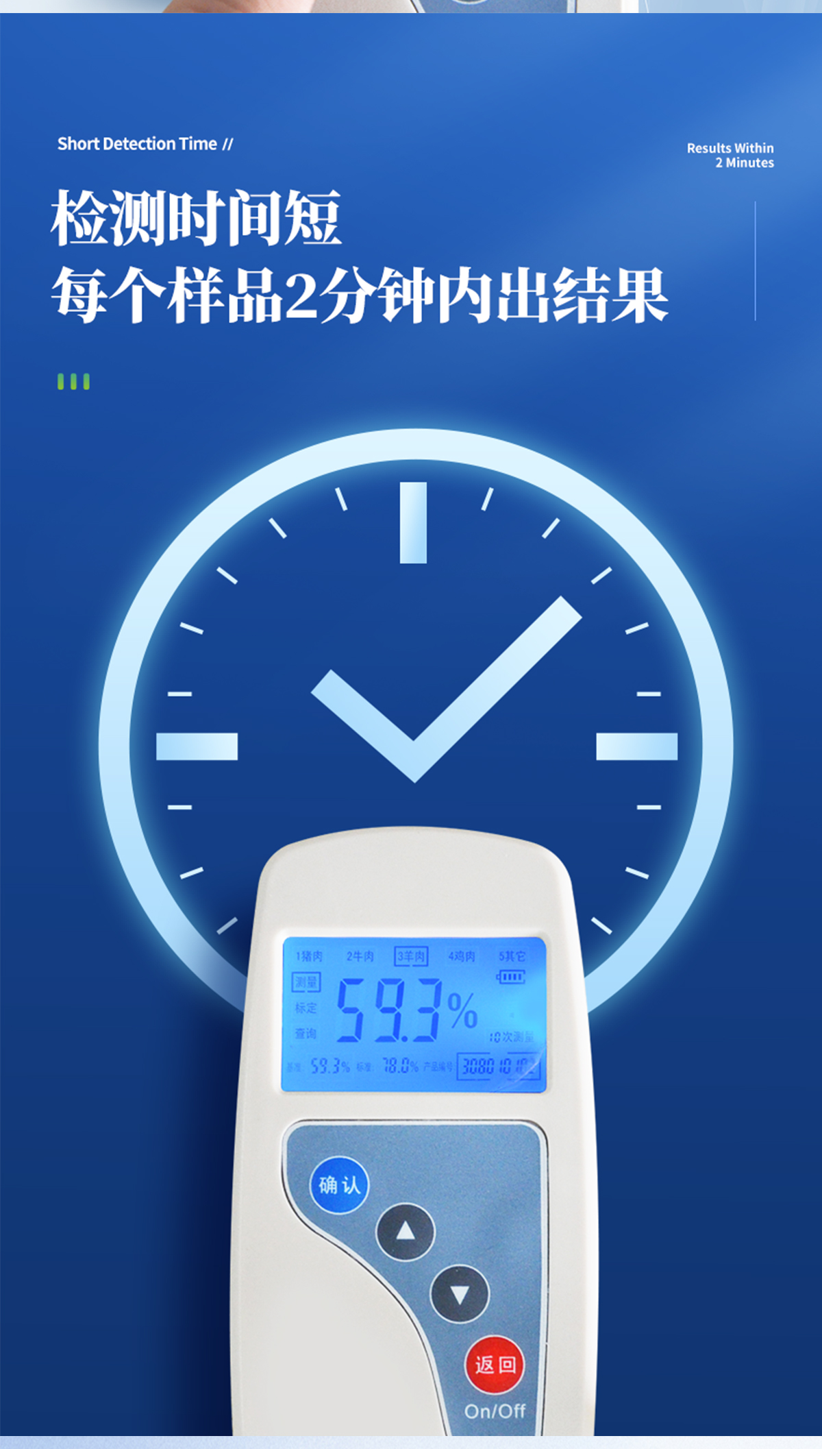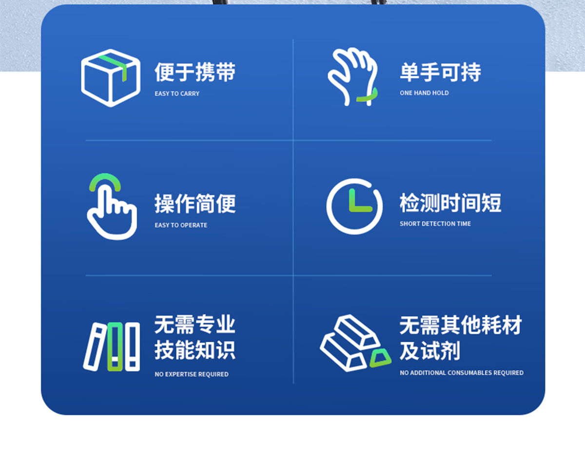| 便于攜帶,單手可持 | 可根據測定對象的品種,設定相應的判斷標準值 | 操作簡便,檢測人員無需專業技能知識 | 檢測時間短,每個樣品2分鐘內出結果; | 檢測試驗無需其他耗材及試劑 |