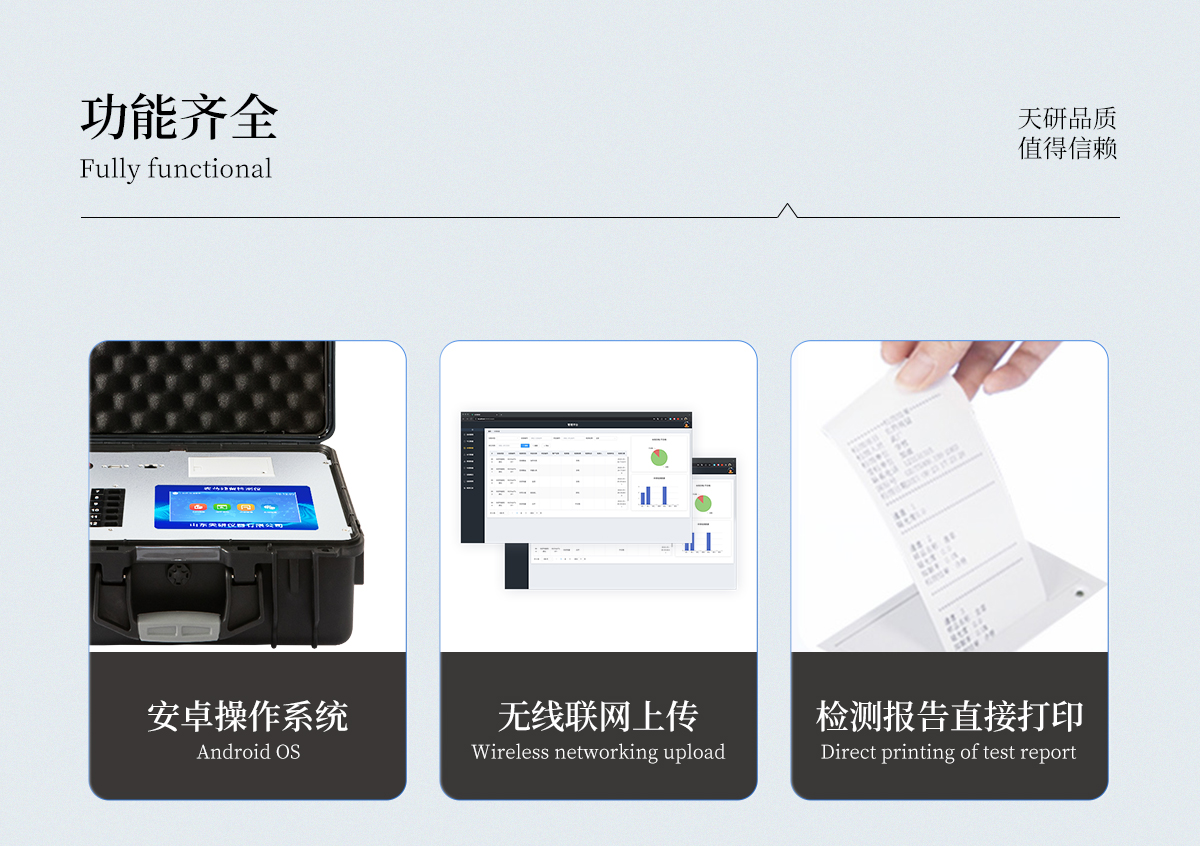 | 機箱采用工業級ABS工程塑料箱,方便攜帶,穩固耐用,便于流動測試。 | 智能操作系統,采用更加人性化操作,主控采用多核處理器,主頻1.88Ghz,運轉速度更快速,穩定性更強。 | 自動判斷樣品是否合格,檢測結果更加直觀。 | 儀器具有100多種蔬菜名稱菜單庫,分類管理,并可按需添加或刪除蔬菜名,編輯蔬菜名稱,可直接打印出蔬菜名稱。 | 檢測通道:12個檢測通道,可以同時測試多個樣品,循環檢測,即放即檢,每個樣品由程序控制分別獨立工作,不會互相干擾。 | 儀器具有wifi聯網功能,可將數據快速上傳電腦,進行數據管理與統計,4G信號GPRS遠傳功能,可插手機卡實現數據遠傳平臺,。 | 顯示方式:7英寸高靈敏真彩觸摸屏顯示,人性化中文操作界面,讀數直觀、簡單。 | 打印機采用串口5v打印,可選擇手動打印或者自動打印,三分鐘出打印結果,打印格式為檢測人姓名、吸光度差值、檢測時間、檢測機構、樣品名稱及結果判定。 | 光源采用進口超高亮發光二極管,具有低功耗、高精度、穩定性強、光源可控可以關掉不使用的光源,響應速度快等優點。 | 智能恒流穩壓,光強自動校準,長時間連續工作光源無溫漂現象。 | 采用USB2.0接口設計,方便數據的存貯和移動,并可隨時與計算機直接相連,并且可用計算機控制儀器。實現數據查詢、瀏覽、分析、統計、打印等。 | 智能化程度高,儀器具有自檢功能:具有開機自檢和調零功能,具有自動檢測重復性功能 | 儀器具有自身保護功能,可設置用戶名及密碼,防止非工作人員操作等。 | 采用DC12v直流供電,安全系統更高,并且配備6A鋰電池充電器。 | 儀器具有重新校準、鎖定、恢復出廠設置功能。 |