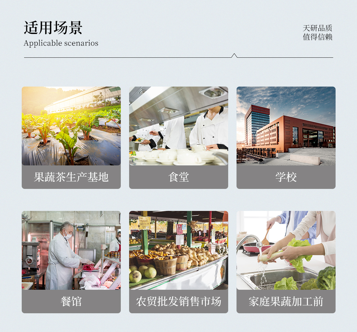 廣泛應用于主要用于蔬菜、水果、茶葉、糧食、農副產品等食品中有機磷和氨基甲酸酯類農藥殘留的快速檢測;此外還可用于果蔬茶生產基地和農貿批發銷售市場現場檢測,餐館、學校、食堂、家庭果蔬加工前的安全速測等。