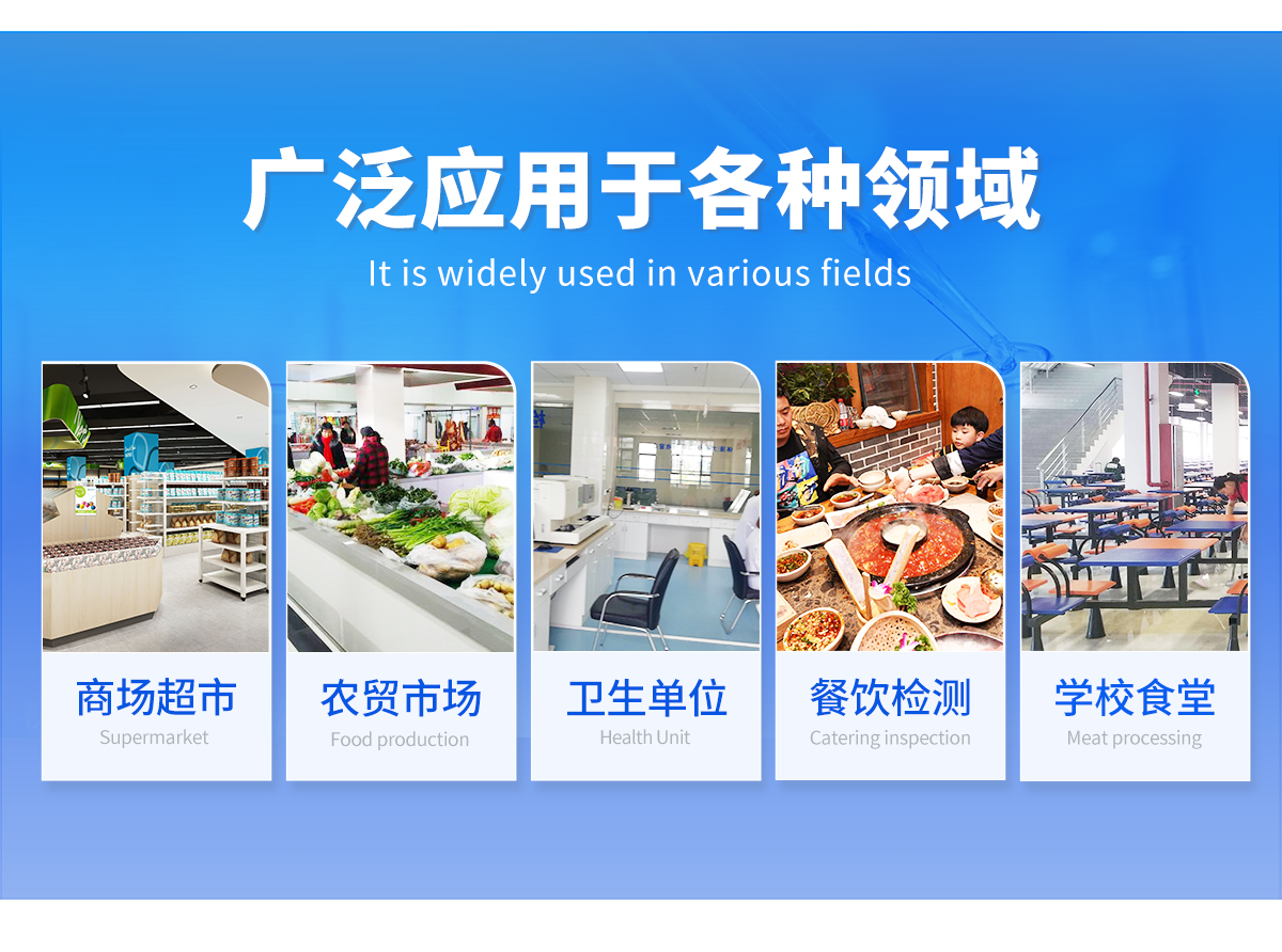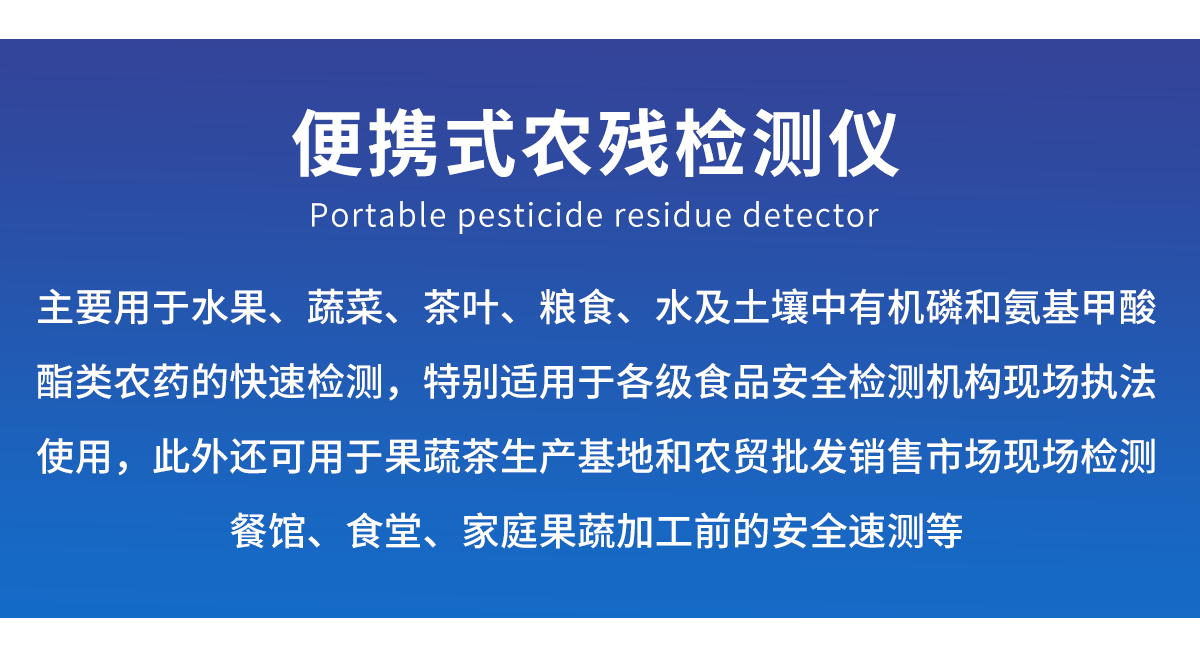 主要用于水果、蔬菜、茶葉、糧食、水及土壤中有機磷和氨基甲酸酯類農藥的快速檢測,特別適用于各級食品安全檢測機構現場執法使用,此外還可用于果蔬茶生產基地和農貿批發銷售市場現場檢測,餐館、食堂、家庭果蔬加工前的安全速測等
