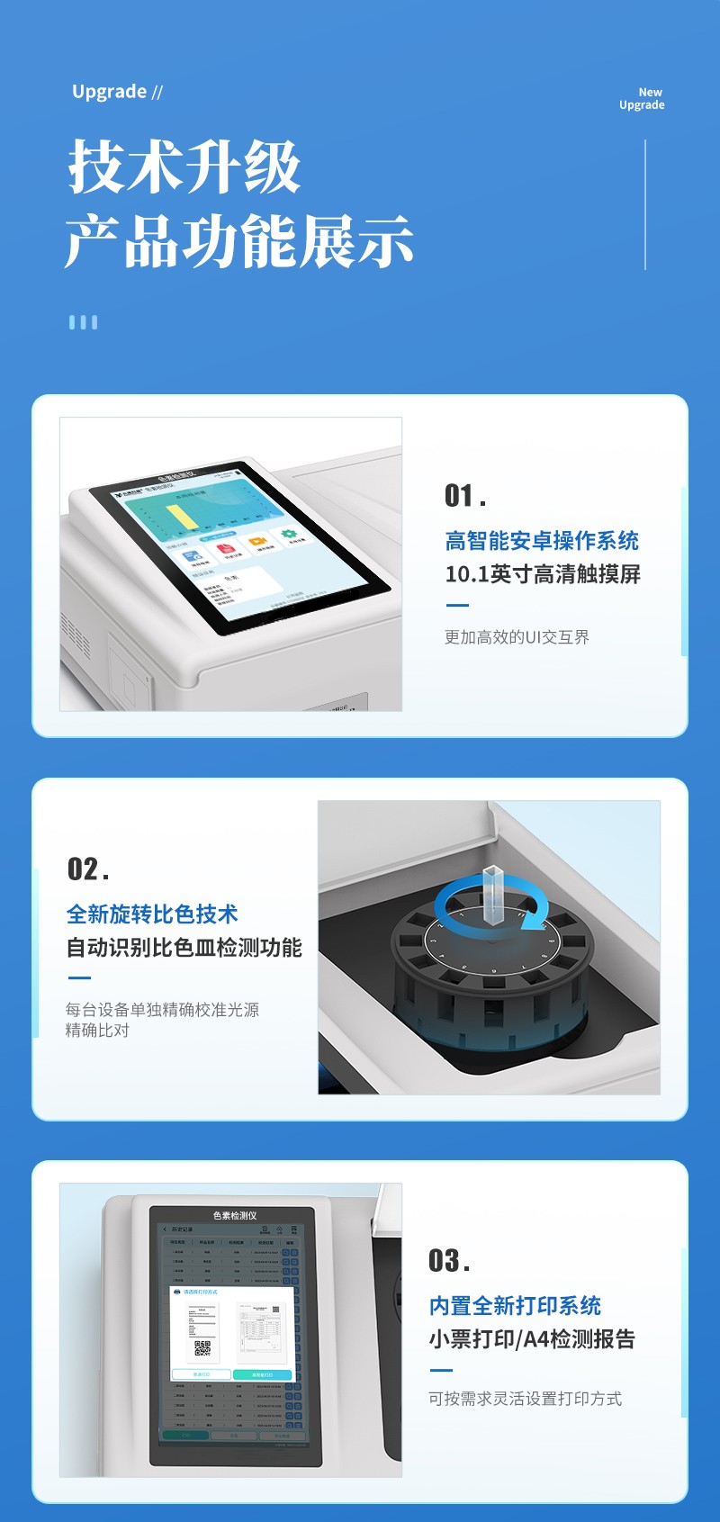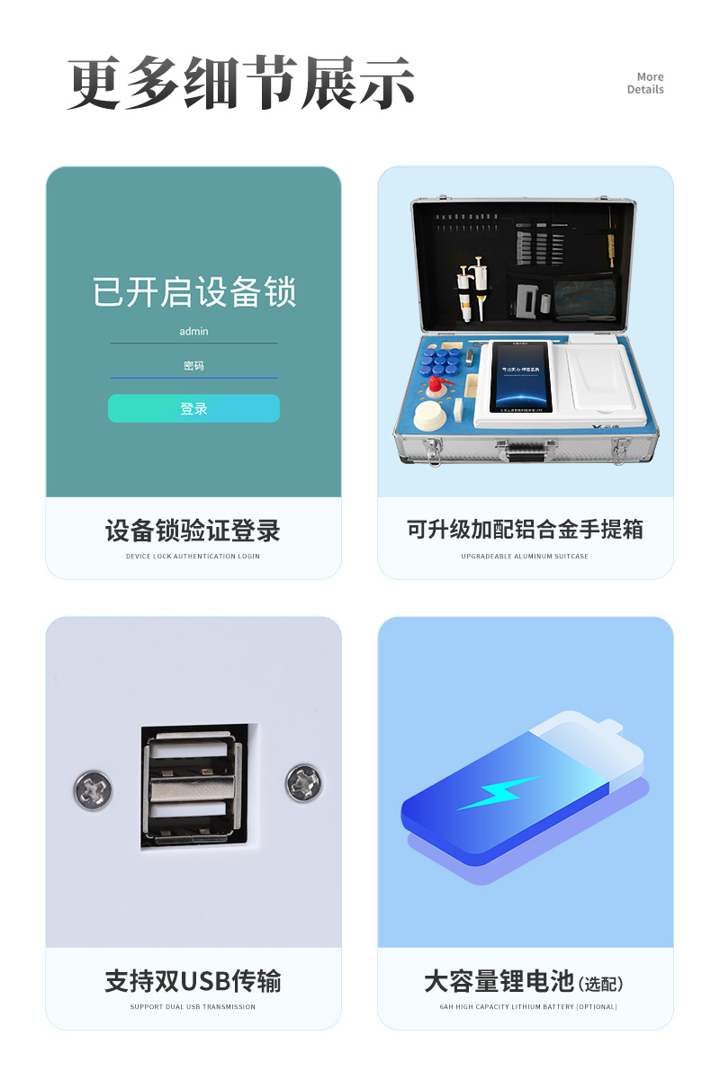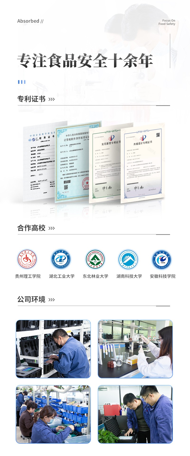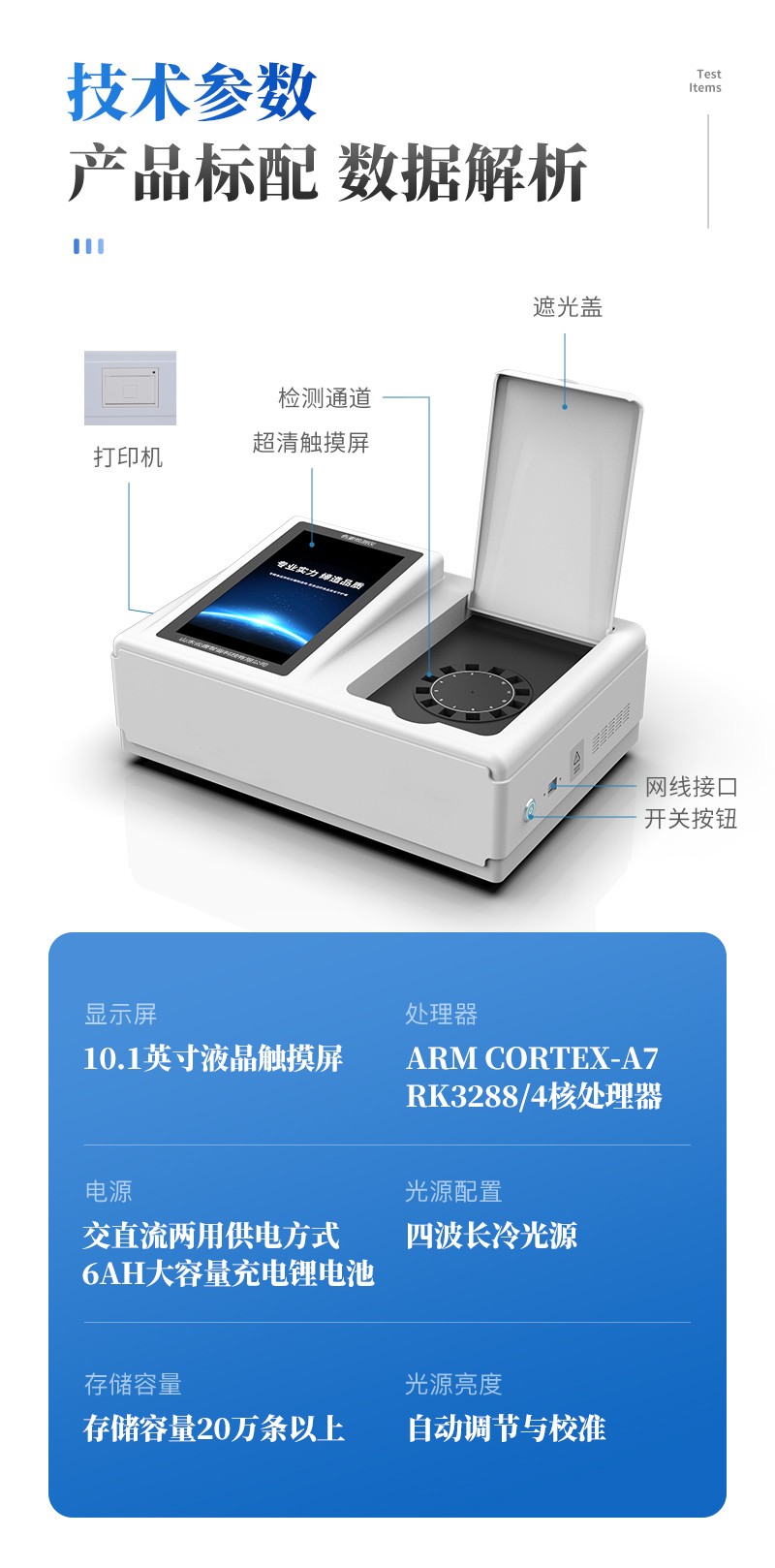 | 儀器采用臺式一體化系統檢測技術,將分光光度模塊、新型農殘檢測模塊、數字化管理模塊、無線通訊模塊高度集成于一體,支持檢測200種食品安全檢測項目,同時預留升級檢測方法。 | 儀器檢測模塊標準化、智能化,可隨意自由組合。檢測箱體內置多個標準檢測單元,檢測模塊可以調整配置。 | 儀器采用全新安卓智能系統,主控芯片采用 ARM Cortex-A7,RK3288/4核處理器,10.1寸高清液晶觸摸豎屏,更加**的UI交互界面,運轉快捷;儀器配備無線通信模塊: 4G(APN)通訊模塊、Wifi模塊,藍牙傳輸,同時具有雙USB接口以及RJ45接口能以多種方式實現數據保存和數據傳輸功能。 | 創新檢測模式: | ★檢測通道:≥12通道;采用精密旋轉比色池設計,使用同芯片同光源校準精度,解決不同光源之間的誤差值。1-12通道間誤差0.1%。(**號:ZL202022821055.2) | ★儀器具有自動識別比色皿檢測功能,即:將樣品比色皿放入儀器后,點擊樣品檢測,儀器自動識別比色皿進行通道檢測。 | 進口高精光源: | 高精度進口四波長冷光源,通道配置 410、520、590、630nm 波長光源,一個光源芯片驅動一個光源,誤差極小,每臺設備單獨**校準光源,**比對,同時參照四種不同波段光源全方位覆蓋市面上99%的農殘食品項目檢測。 | 智能化操作系統: | 便捷操作系統:設備檢測時可在同一檢測界面自動對應相關檢測通道一次性選擇1-12個樣品名稱,無須退出界面,節省操作時間。 | 數據集成系統:設備首頁自動統計檢測數據包含:周檢測數據、月檢測數據,全部檢測總數量,均包含檢測總數,合格數,不合格數,以及相關柱形分析圖,對各項檢測數據清晰掌握,無需電腦查詢,更加快捷直觀。 | 項目預設系統:支持添加單個及多個相同或不相同的任務預設,一鍵快速調取,每一個任務分別可以設置不同的樣品、批次、編號、來源、備注、抽樣信息、檢測信息、受檢信息、復核信息等更多信息。無縫鏈接平臺和APP實時查看下發任務。 | 數據監管系統:同步對接監管平臺,數據可局域網和互聯網數據上傳,檢測結果可選擇直接傳至食品安全監管平臺。集成OSS輸出存儲服務、區分設備定向管理應用,進行區域食品安全監管及大數據分析處理與數據統計,檢測區域食品安全長短期動態,達到食品安全問題預估、預警。 | 自定義打印系統:內置全新打印系統,新創自定義打印方式,可按需靈活設置開啟或關閉:產品合格證(國家農業部標準要求),二維碼,抽樣信息、檢測信息,受檢信息、復核信息、抽樣日期、檢測日期等信息的打印。 | 系統遠程更新功能:可定向分客戶分儀器更新系統,按照不同客戶后期實際需求添加項目,無需機器返廠,即可遠程實時升級全新系統,節省時間成本及避免運輸造成設備損壞。 | 儀器主機采用一體化防水、抗壓、防撞擊、防腐蝕箱體設計,同時配備交直流供電,可連接車載電源,可選配大容量充電鋰電池,滿足現場野外檢測需求。 | 安全證書,放心保障:儀器具有中國計量科學研究院校準證書,**認證。 |