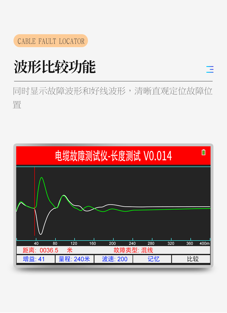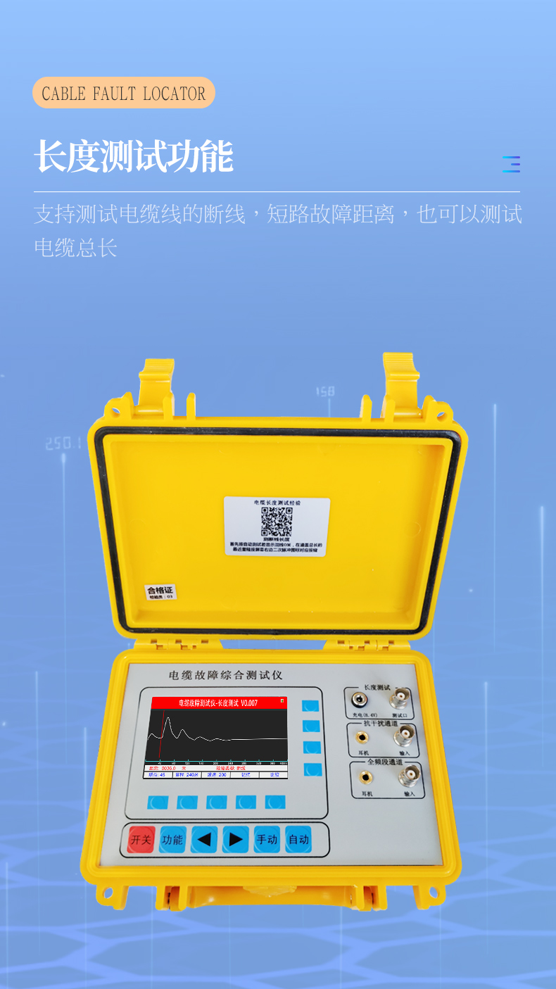 1、長度測試:斷電狀態下可以直接測試電纜的斷線、短路故障距離長度。2、斷電狀態下配合信號發生器定位直埋電纜對地漏電位置,測地埋電纜路徑走向及深度。3、全頻段通道:通電狀態下使用探桿測試直埋低壓電纜對地輕微漏電故障位置。是縮短故障查找時間、提高工作效率、減輕線路維護人員勞動強度的得力工具。