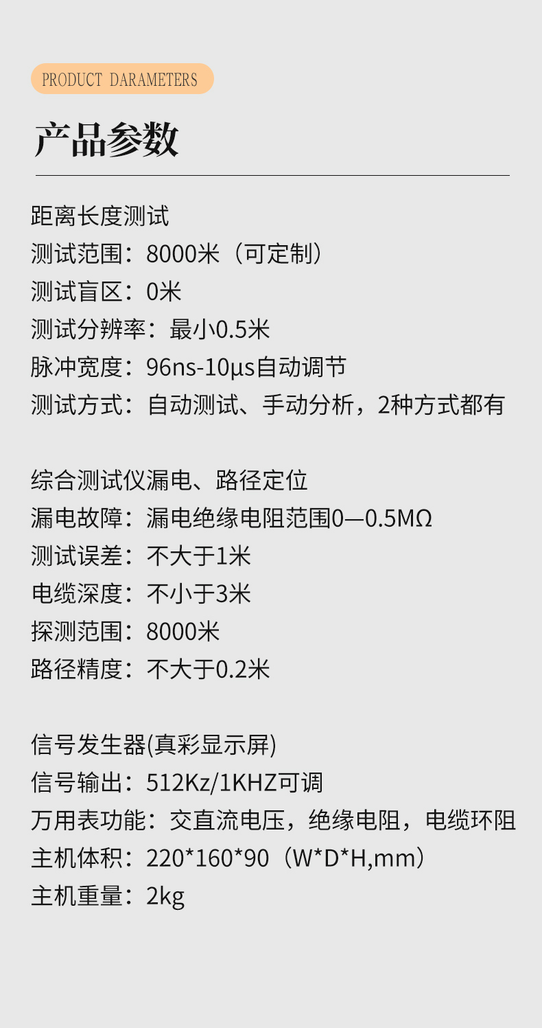 測試儀主機........... 1臺信號發生器........... 1臺測試耳機.............. 1個專用充電器........... 2個路徑探頭...............1付漏電探桿.............. 1付長度測試線(信號器連接線..與長度測試通用)......1條接地釬.................. 1個儀器包.................. 2個說明書.................. 1個合格證保修卡.........1組