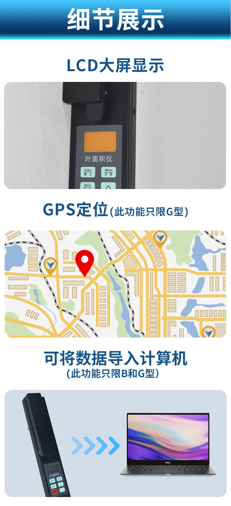 儀器可以直接測量葉片長度、寬度和面積,并集成了GPS定位系統(tǒng),增加了RS232接口,可將測量數(shù)據(jù)和定位信息同時導(dǎo)入計算機,方便廣大科研者對數(shù)據(jù)的進一步處理。