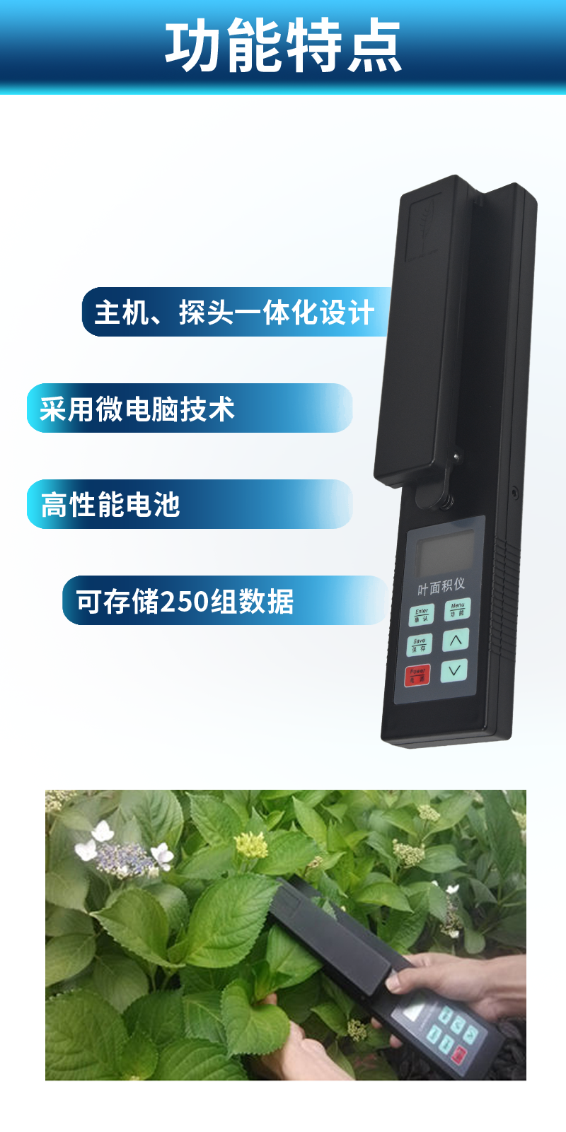 1)主機、探頭一體化設(shè)計,更方便操作。2)采用微電腦技術(shù),LCD大液晶顯示。3)高性能電池,無需外部供電,低電壓顯示,更適用于野外測量。4)一次性可測量較大葉片面積(1000*155mm2)5)可存儲250組數(shù)據(jù)(葉面積、葉長、葉寬)。6)可測量葉片的多種參數(shù):葉面積、平均葉面積、葉長、葉寬。7)通訊接口:RSR232接口,可將數(shù)據(jù)導(dǎo)入計算機。(此功能只限B和G型)8)GPS定位:集成高速GPS定位模塊,上傳數(shù)據(jù)都自帶時間、經(jīng)緯度信息,方便更有效的