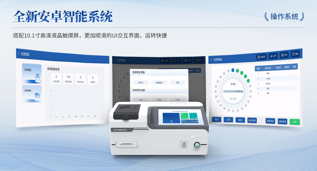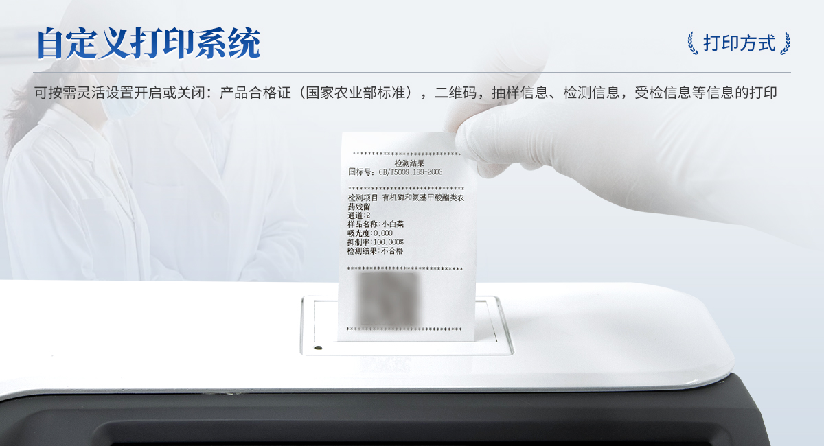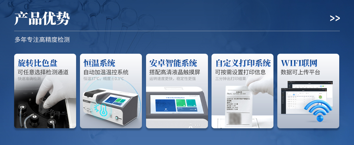 | 1. 試劑位置:3個(gè) | 2. 檢測形式:旋轉(zhuǎn)24通道比色盤,可任意選擇檢測通道,自動(dòng)對(duì)應(yīng)選擇通道。 | 3. 系統(tǒng)配置:10.1寸高清液晶觸摸屏,采用ARM Cortex?-A7,RK3288/4核處理器,運(yùn)行內(nèi)存1GB。Android7.1.1 系統(tǒng)分辨率1280×800。 | 4.恒溫系統(tǒng):具有自動(dòng)加溫溫控系統(tǒng),精準(zhǔn)恒溫37℃,精度±0.1℃。 | 5.添加系統(tǒng):儀器按照試劑要求自動(dòng)、按時(shí)、按量加入試劑,并且自動(dòng)對(duì)未正常放置的樣本或異常的樣本進(jìn)行檢查并提示。 | 6.清洗功能:儀器具備回流及自動(dòng)清洗管路功能,避免試劑污染。 | 7.混勻功能:設(shè)備具備自動(dòng)混勻功能。 | 8.光源校準(zhǔn):設(shè)備可自動(dòng)校準(zhǔn),確保檢測準(zhǔn)確度。 | 9.實(shí)時(shí)監(jiān)控:儀器測試過程中屏幕顯示運(yùn)行狀態(tài),可實(shí)時(shí)查看。 | 10.數(shù)據(jù)存儲(chǔ):內(nèi)部存儲(chǔ)16GB,可存儲(chǔ)500萬條數(shù)據(jù)。 | 11.樣品多選功能:設(shè)備具備樣品一鍵多選功能,選擇樣品自動(dòng)匹配檢測通道。 | 12.項(xiàng)目預(yù)設(shè):可提前設(shè)置單個(gè)及多個(gè)相同或不相同的檢測任務(wù),可單次或者多次調(diào)取,減少檢測時(shí)間。 | 13.自定義打印系統(tǒng):內(nèi)置自定義打印系統(tǒng),可按需靈活設(shè)置開啟或關(guān)閉:產(chǎn)品合格證(國家農(nóng)業(yè)部標(biāo)準(zhǔn)),二維碼,抽樣信息、檢測信息,受檢信息等信息的打印。 | 14.A4版本報(bào)告打印功能:設(shè)備可自動(dòng)生成A4版報(bào)告,A4報(bào)告帶二維碼,可掃描二維碼生成電子版,并可識(shí)別真?zhèn)巍?/td> | 15.傳輸方式:儀器配備無線通信模塊: 4G(APN)通訊模塊、Wifi模塊,藍(lán)牙傳輸模塊,同時(shí)具有USB接口以及RJ45接口能以多種方式實(shí)現(xiàn)數(shù)據(jù)保存和數(shù)據(jù)傳輸功能,設(shè)備數(shù)據(jù)可以同步上傳至平臺(tái)。 | 16.數(shù)據(jù)監(jiān)管系統(tǒng):設(shè)備自帶監(jiān)管平臺(tái),并可同步對(duì)接監(jiān)管平臺(tái),數(shù)據(jù)可局域網(wǎng)和互聯(lián)網(wǎng)數(shù)據(jù)上傳,檢測結(jié)果可直接傳至食品安全監(jiān)管平臺(tái)。達(dá)到食品安全問題預(yù)估、預(yù)警。 | 17.系統(tǒng)遠(yuǎn)程更新功能:無需設(shè)備返廠,即可遠(yuǎn)程實(shí)時(shí)升級(jí)全新系統(tǒng),節(jié)省時(shí)間成本及避免運(yùn)輸造成設(shè)備損。 |