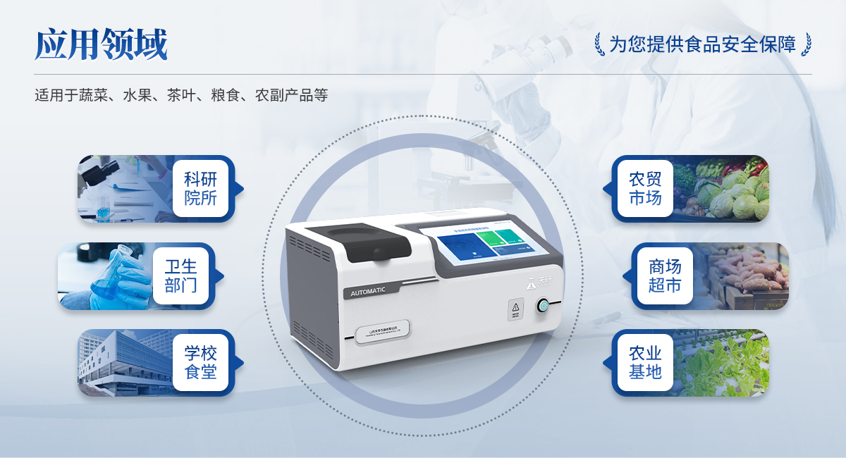 全自動(dòng)農(nóng)藥殘留檢測儀是依據(jù)國家標(biāo)準(zhǔn)方法(GB/T5009.199-2003),采用酶抑制率比色法對(duì)水果、蔬菜等農(nóng)產(chǎn)品中有機(jī)磷和氨基甲酸酯類農(nóng)藥含量進(jìn)行快速準(zhǔn)確的檢測。該設(shè)備廣泛應(yīng)用于蔬菜批發(fā)市場、超市、商場、食藥監(jiān)等部門的蔬菜和水果中的農(nóng)藥殘留檢測。