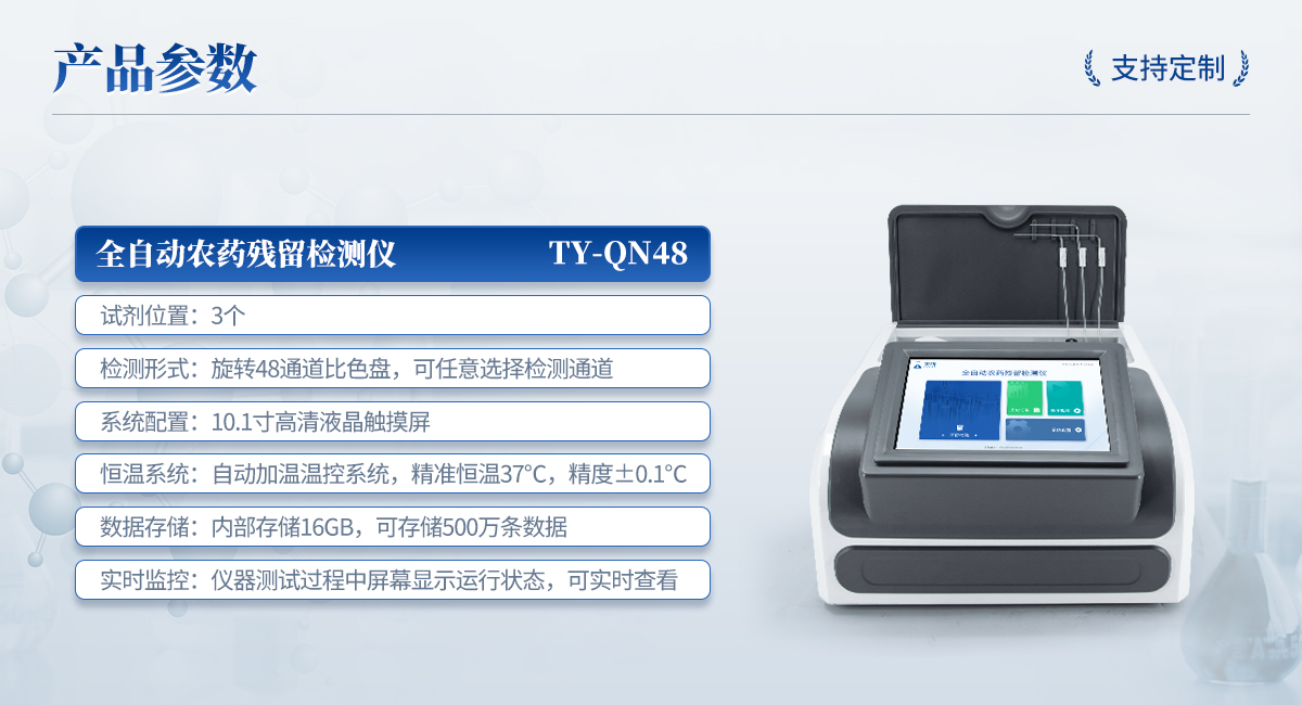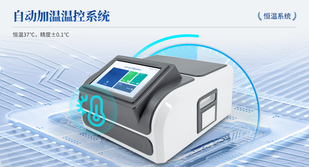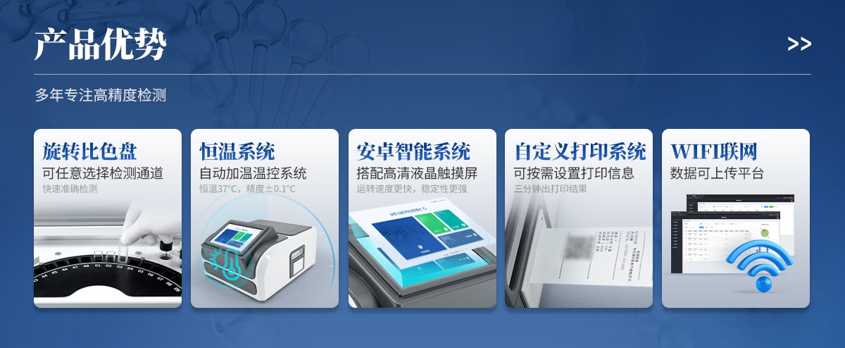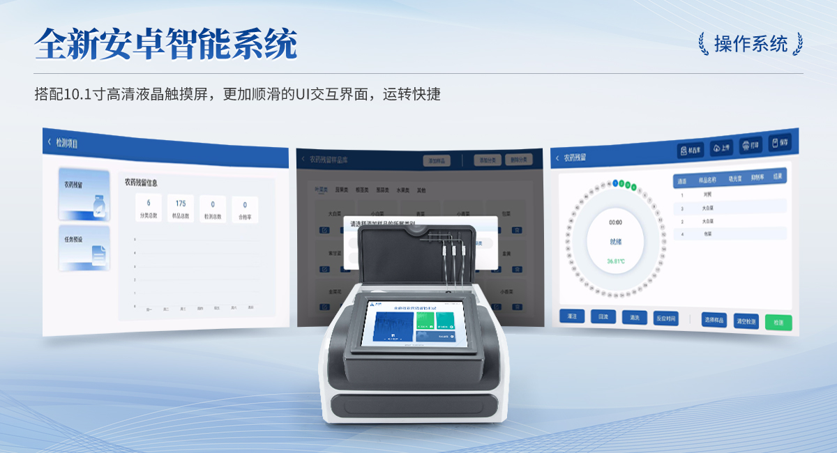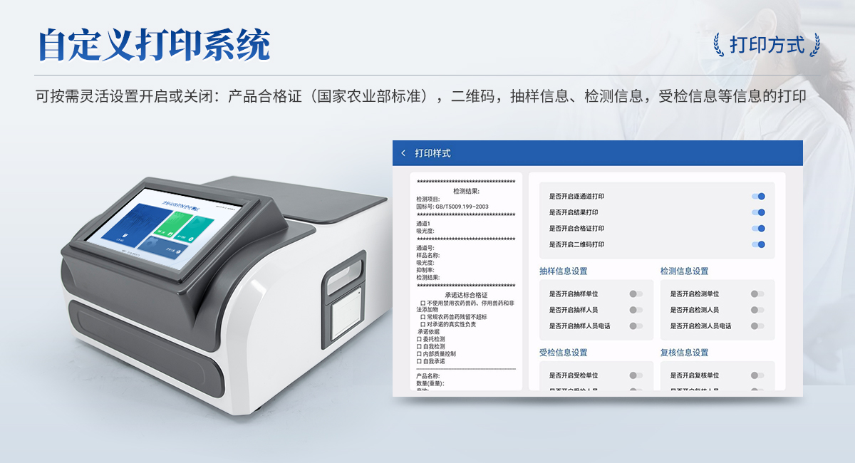 | 1. 試劑位置:3個 | 2. 檢測形式:旋轉48通道比色盤,可任意選擇檢測通道,自動對應選擇通道。 | 3. 系統配置:10.1寸高清液晶觸摸屏,采用ARM Cortex-A7,RK3288/4核處理器,運行內存1GB。Android7.1.1 系統分辨率1280×800。 | 4.恒溫系統:具有自動加溫溫控系統,精準恒溫37℃,精度±0.1℃。 | 5.添加系統:儀器按照試劑要求自動、按時、按量加入試劑,并且自動對未正常放置的樣本或異常的樣本進行檢查并提示。 | 6.清洗功能:儀器具備回流及自動清洗管路功能,避免試劑污染。 | 7.混勻功能:設備具備自動混勻功能。 | 8.光源校準:設備可自動校準,確保檢測準確度。 | 9.實時監控:儀器測試過程中屏幕顯示運行狀態,可實時查看。 | 10.數據存儲:內部存儲16GB,可存儲500萬條數據。 | 11.樣品多選功能:設備具備樣品一鍵多選功能,選擇樣品自動匹配檢測通道。 | 12.項目預設:可提前設置單個及多個相同或不相同的檢測任務,可單次或者多次調取,減少檢測時間。 | 13.自定義打印系統:內置自定義打印系統,可按需靈活設置開啟或關閉:產品合格證(國家農業部標準),二維碼,抽樣信息、檢測信息,受檢信息等信息的打印。 | 14.A4版本報告打印功能:設備可自動生成A4版報告,A4報告帶二維碼,可掃描二維碼生成電子版,并可識別真偽。 | 15.傳輸方式:儀器配備無線通信模塊: 4G(APN)通訊模塊、Wifi模塊,藍牙傳輸模塊,同時具有USB接口以及RJ45接口能以多種方式實現數據保存和數據傳輸功能,設備數據可以同步上傳至平臺。 | 16.數據監管系統:設備自帶監管平臺,并可同步對接監管平臺,數據可局域網和互聯網數據上傳,檢測結果可直接傳至食品安全監管平臺。達到食品安全問題預估、預警。 | 17.系統遠程更新功能:無需設備返廠,即可遠程實時升級全新系統,節省時間成本及避免運輸造成設備損。 |