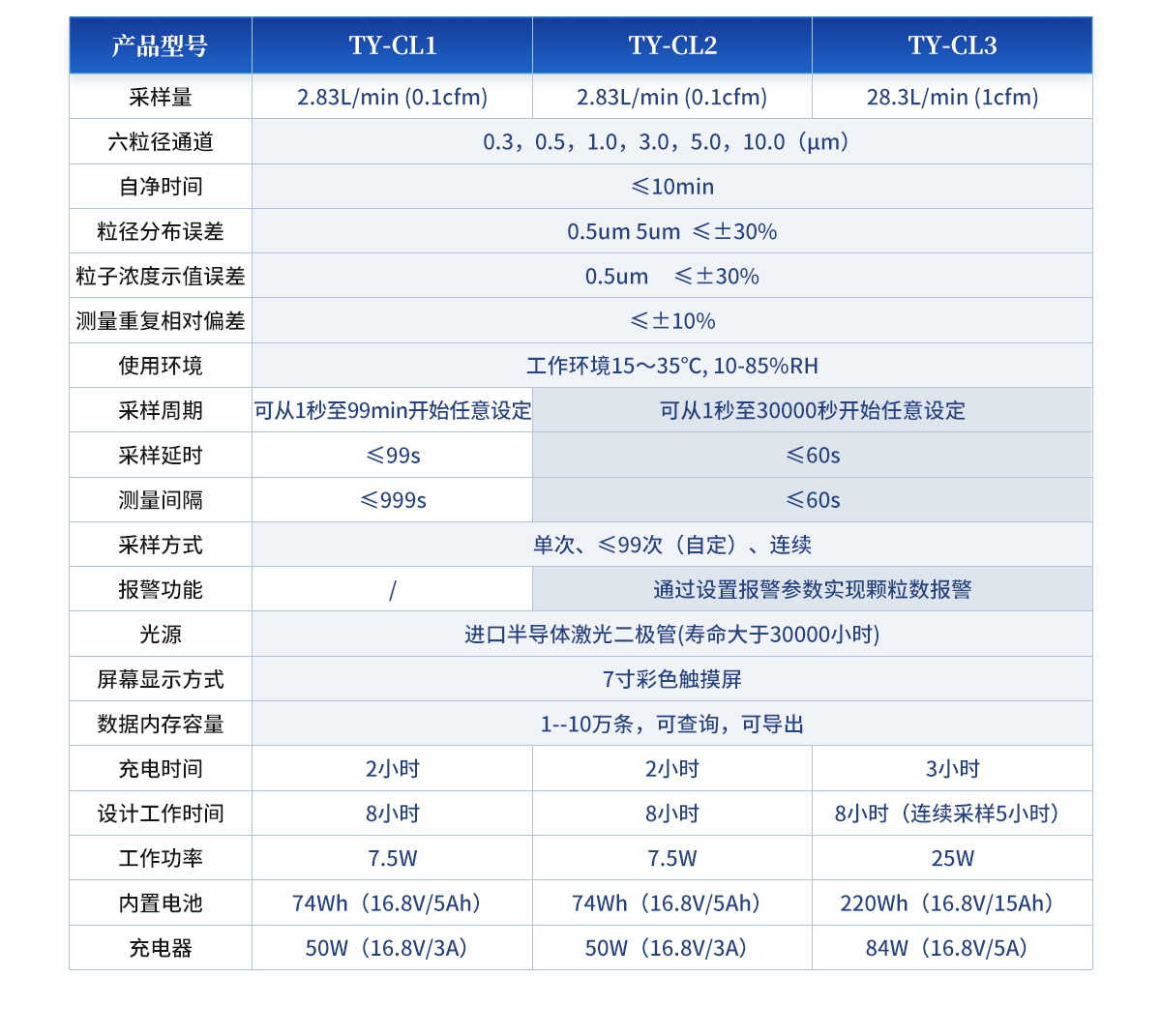 | 采樣量:2.83L/min (0.1cfm) | 六粒徑通道:0.3,0.5,1.0,3.0,5.0,10.0(μm) | 自凈時間:≤10min | 粒徑分布誤差:0.5um 5um ≤±30% | 粒子濃度示值誤差:0.5um ≤±30% | 測量重復相對偏差:≤±10% | 使用環境:工作環境15~35℃, 10-85%RH | 采樣周期:可從1秒至99min開始任意設定 | 采樣延時:≤99s | 測量間隔:≤999s | 采樣方式:單次、≤99次(自定)、連續 | 光源:進口半導體激光二極管(壽命大于30000小時) | 屏幕顯示方式:7寸彩色觸摸屏 | 數據內存容量:1--10萬條,可查詢,可導出。 | 充電時間:2小時 | 設計工作時間:8小時 | 平均功率:7.5W | 內置電池:74Wh(16.8V/5Ah) | 充電器:50W(16.8V/3A) |