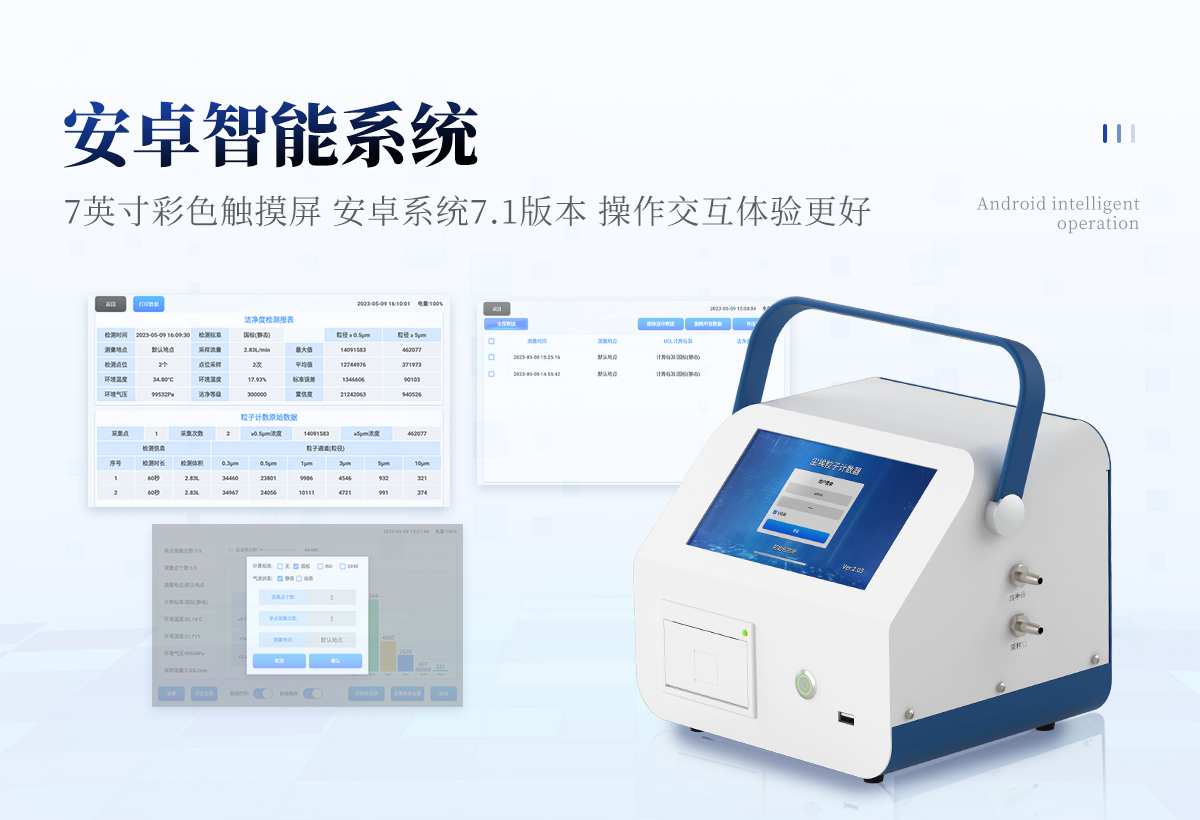 | 1、安卓系統7.1版本,操作交互體驗更好。 | 2、內置溫濕度傳感器、環境氣壓傳感器 | 3、核心部件光散射傳感器明顯消除腔體的雜散光,信噪比大為提高。從而使測量更準確更可靠。 | 4、按95%置信度(UCL)計算,計數結果可換算成m3和ft3 | 5、依照凈化級別劃分和規定,自動判定凈化級別,使用便利。 | 6、支持wifi、藍牙傳輸,數據可無線上傳;同時支持U盤拷貝數據,免驅動插拔。 | 7、配置監管平臺,檢測結果可直接無線傳至平臺,進行潔凈度長短期分析,輔助管理。 | 8、內置新一代高速熱敏打印機,可選擇所需要打印的粒徑通道,靈活打印結果。 | 9、交直流兩用,內置充電鋰電池,環保耐用可支持連續采樣6小時以上。 | 10、便捷簡易伸縮式云臺支架,安裝采樣操作更加方便。 |