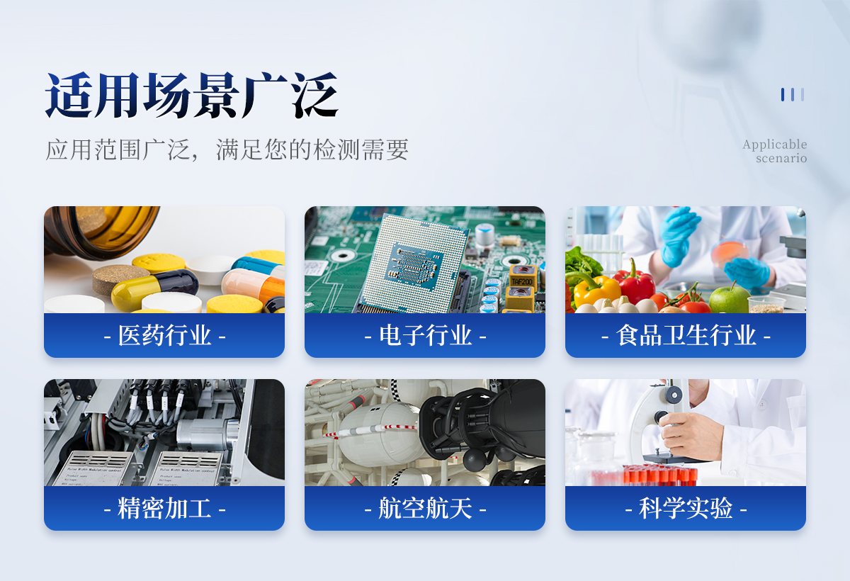 滿足醫藥行業(制藥廠、藥檢所、醫院手術室等);電子行業(半導體工廠、精密機械的生產加工等);食品衛生行業(乳制品、塑封肉食品、調味食品、農產品等的精加工);過濾器的生產廠家,檢驗過濾器的質量及效率等;光學、及航空航天等領域的精加工、精密試驗所需的潔凈室(區)的檢測需要。