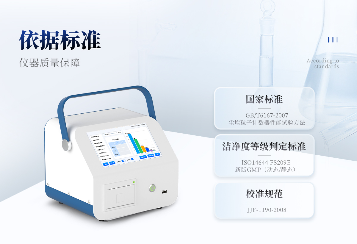 國家標準:GB/T6167-2007塵埃粒子計數器性能試驗方法 潔凈度等級判定標準:ISO14644 FS209E ,新版GMP(動態/靜態) 校準規范:JJF-1190-2008