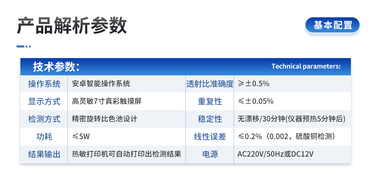 | 1.電源:交流 220±22V 直流 12V+5V(儀器內(nèi)置鋰電池也可用車(chē)載電源) | 2.功率: ≤5W | 3.量程及分辨率:0.001-9999 | 4.重復(fù)性誤差: ≤0.02%(0.0002,重鉻酸鉀溶液) | 5.儀器穩(wěn)定性:一個(gè)小時(shí)內(nèi)顯示數(shù)字無(wú)漂移(透光度測(cè)量);兩個(gè)小時(shí)內(nèi)數(shù)字漂移不超過(guò)0.3%(0.003,透光度測(cè)量)、0.001(吸光度測(cè)量)。 | 6.線(xiàn)性誤差: ≤0.1%(0.001,硫酸銅檢測(cè)) | 7.靈敏度:紅光≥4.5 ×10-5 藍(lán)光≥3.17×10-3 綠光≥2.35×10-3 橙光≥2.13×10-3 | 8.波長(zhǎng)范圍 :紅光:680±2nm; 藍(lán)光:420±2nm; 綠光:510±2nm;橙光:590±4nm | 9.顯示屏分辨率:1024*600 | 10.抗震等級(jí):IP65 | 11、儀器尺寸:48×34.5×22cm | 12、主機(jī)凈重:5.2kg |