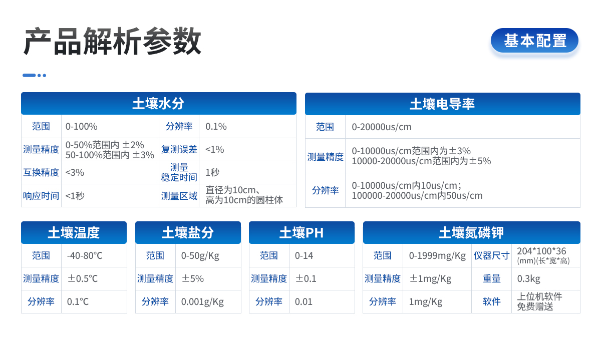 | 土壤水分:(土壤容積含水量:) 單位:%(m3/m3);.測試靈敏度:±0.01 %(m3/m3);.量程:0-100%(m3/m3); 測量精度:0-50%(m3/m3)范圍內)±2%(m3/m3);50-100%(m3/m3)范圍內)±3%(m3/m3); 分辨率:0.1% 互換精度:<3%>復測誤差:<1%>響應時間:<1秒>測量穩定時間:1秒 測量區域:直徑為10cm、高為10cm的圓柱體 | 土壤溫度: 范圍:-40-120℃ 測量精度:±0.2℃ 分辨率:±0.1℃ 互換誤差:<0.2℃>響應時間:<100ms>穩定時間:<1秒> | 土壤鹽分: 范圍:0-20ms .測量精度:±2% .分辨率:±0..1ms 水分溫度材料特性:不銹鋼(抗電解,可經受長期電解,可經受土壤中的酸堿腐蝕) 通訊方式:USB2.0 軟件:上位機軟件免費贈送 線纜:水分國標屏蔽線2米,溫度聚四氟耐高溫導線2米。 測量方式:插入式、埋藏式、剖面等 供電方式:鋰電池供電、交流電兩種方式 可配置GPS模塊,GPRS模塊,短信模塊,MAX485 |