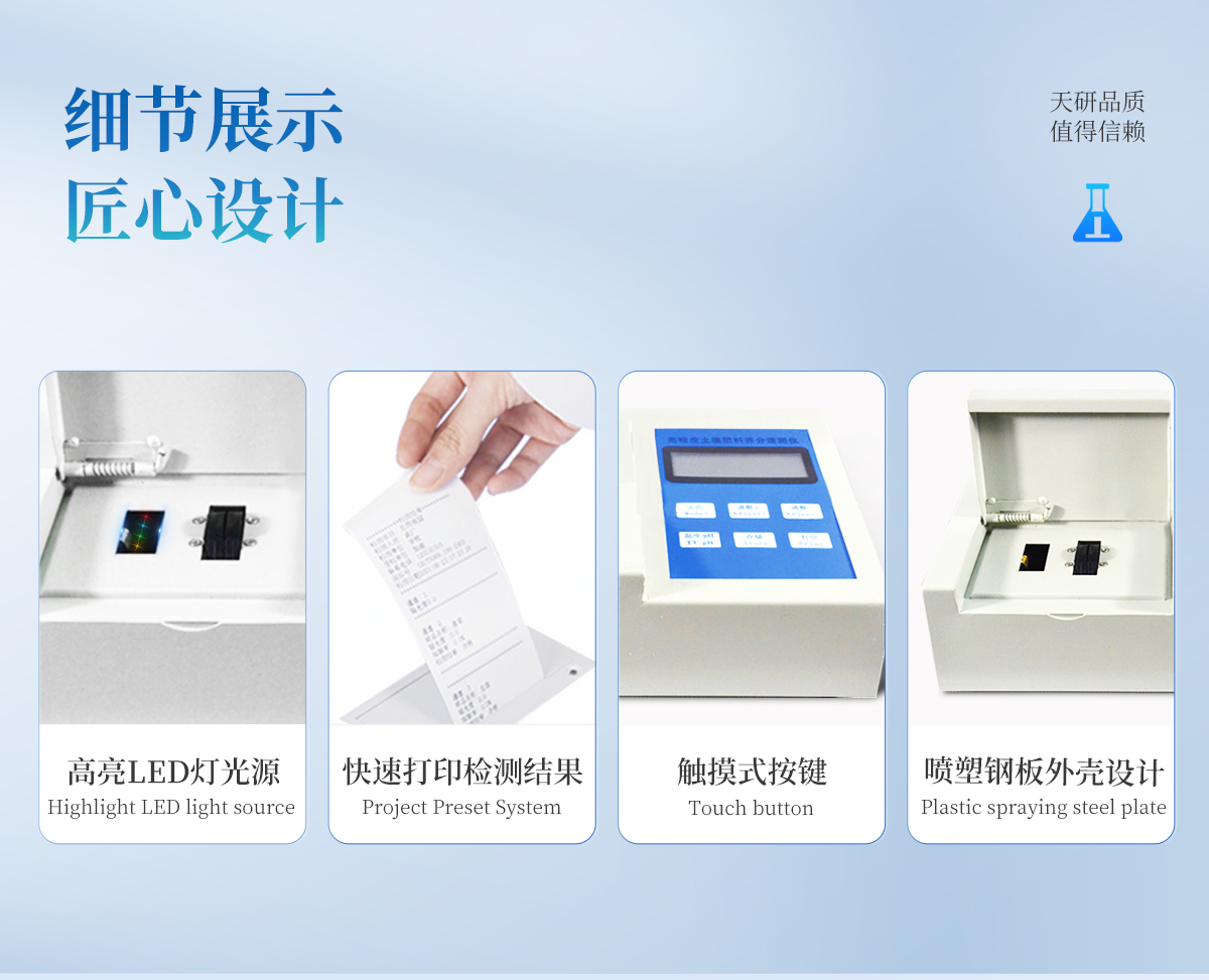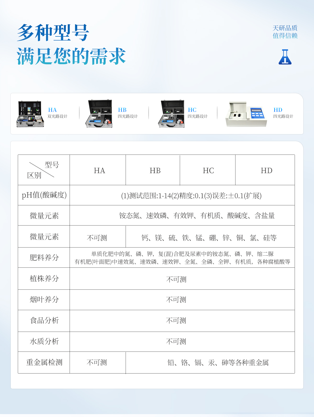 | 升級款,噴塑鋼板外殼設計,堅固耐用,配套成套附件及成品藥劑。 | 微電腦控制,數字化線路、程序化設計,液晶顯示,交直流兩用,可野外流動測試。 | 分辨率:0.001,觸摸式按鍵,內置新一代熱敏打印機,可打印測試結果。 | 肥料養分專用檢測儀可檢測化肥、有機肥(含葉面肥、水溶肥、噴施肥等)中的速效氮、速效磷、有效鉀、全氮、全磷、全鉀、有機質、酸堿度,鈣、鎂、硫、鐵、錳、硼、鋅、銅、氯、硅等各種中微量元素以及鉛、鉻、鎘、汞、砷等各種重金屬含量。 | 采用高亮LED燈光源、雙撥輪濾光式處理技術,保證光源波長穩定, 硅半導體作為信號接收系統,壽命長達10萬小時級別。光源穩定,重現性好,準確度高。 | 比色槽部分采用單通道設計,無機械位移及磨損,光路測試定位**,保證測定結果精度。 | 采用自主分析方法(號:ZL 2018 2 1777724.7),保證檢測結果絕對達到國標要求。 | 內置熱敏打印機,肥料打印結果為百分含量,測試誤差小于0.5%。 |