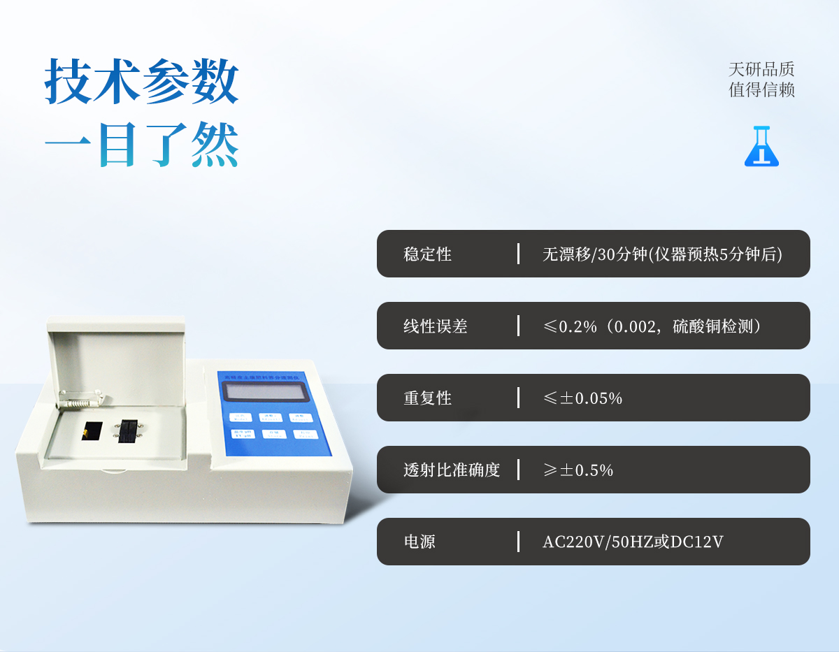 | 儀器透射比準確度 ≥±0.5% | 儀器重復性 ≤±0.05% | 儀器穩定性 無漂移/30分鐘(儀器預熱5分鐘后) | 線性誤差 ≤0.2%(0.002,硫酸銅檢測) | 儀器功耗 ≤5W | 電源 AC220V/50Hz或DC12V | 結果輸出 內置**熱敏打印機可自動打印出檢測結果,方便直觀。 |