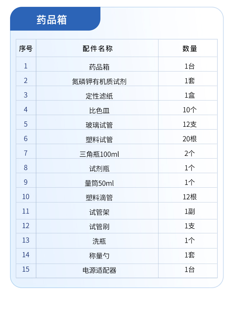 八、全項目土壤肥料養(yǎng)分檢測儀配置清單: