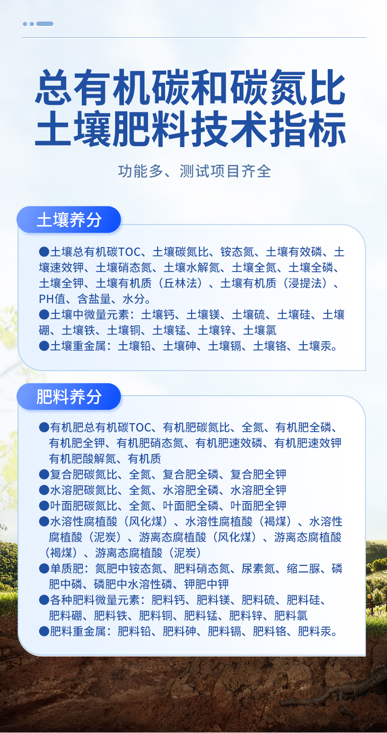 | 1、土壤養(yǎng)分:●土壤銨態(tài)氮、土壤有效磷、土壤速效鉀、土壤硝態(tài)氮、土壤水解氮、土壤全氮、土壤全磷、土壤全鉀、土壤有機質(zhì)(丘林法)、土壤有機質(zhì)(浸提法)、土壤總有機碳、土壤碳氮比、PH值、含鹽量、水分。●土壤中微量元素:土壤鈣、土壤鎂、土壤硫、土壤硅、土壤硼、土壤鐵、土壤銅、土壤錳、土壤鋅、土壤氯、土壤鉬;●土壤重金屬:土壤鉛、土壤砷、土壤鎘、土壤鉻、土壤汞、土壤鎳、土壤鋁、土壤氟、土壤鈦、土壤硒。 | 2、肥料養(yǎng)分:●單質(zhì)肥:氮肥中銨態(tài)氮、肥料硝態(tài)氮、尿素氮、縮二脲、磷肥中磷、磷肥中水溶性磷、鉀肥中鉀;●復合肥全氮、復合肥全磷、復合肥全鉀;●有機肥全氮、有機肥全磷、有機肥全鉀、有機肥硝態(tài)氮、有機肥速效磷、有機肥速效鉀、有機肥酸解氮、有機質(zhì);●水溶性腐植酸(風化煤)、水溶性腐植酸(褐煤)、水溶性腐植酸(泥炭)、游離態(tài)腐植酸(風化煤)、游離態(tài)腐植酸(褐煤)、游離態(tài)腐植酸(泥炭);●水溶肥全氮、水溶肥全磷、水溶肥全鉀;●葉面肥全氮、葉面肥全磷、葉面肥全鉀;●各種肥料微量元素:肥料鈣、肥料鎂、肥料硫、肥料硅、肥料硼、肥料鐵、肥料銅、肥料錳、肥料鋅、肥料氯、肥料鉬;●肥料重金屬:肥料鉛、肥料砷、肥料鎘、肥料鉻、肥料汞、肥料鎳、肥料鋁、肥料氟、肥料鈦、肥料硒。 | 3、鮮作物營養(yǎng):●作物硝態(tài)氮、作物銨態(tài)氮、作物磷、作物鉀;●作物中微量元素:作物鈣、作物鎂、作物硫、作物硅、作物硼、作物鐵、作物銅、作物錳、作物鋅、作物氯、作物鉬;●作物中硝酸鹽、亞硝酸鹽。 | 4、干植株營養(yǎng):●植株全氮、植株全磷、植株全鉀 | 5、煙葉營養(yǎng):●全氮、全磷、全鉀、還原糖、水溶性總糖、硼、錳、鐵、銅、鈣、鎂等20項。 | 6、食品(水果、蔬菜等):●硝酸鹽、亞硝酸鹽、重金屬(鉛、鉻、鎘、砷、汞)等項。 | 7、水質(zhì)中:●銨態(tài)氮、水中磷、水中鉀、硝酸鹽、亞硝酸鹽、硬度、PH、鐵、銅、錳、鋅、硼、氯、硫、硅、鉬等 |
