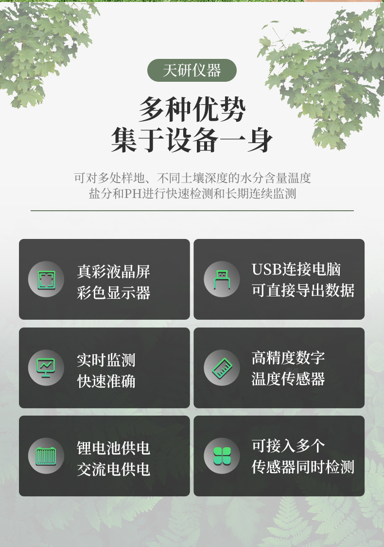 產(chǎn)品描述:產(chǎn)品簡介: 土壤水分溫度鹽分PH測定儀采用一體化結(jié)構(gòu)設(shè)計,可快速準確測量土壤中含水量、溫度、電導率(鹽分)、酸堿度,可對多處樣地、不同土壤深度的水分含量溫度鹽分和PH進行快速檢測和長期連續(xù)監(jiān)測。廣泛應用于土壤墑情檢測、旱作節(jié)水灌溉、精細農(nóng)業(yè)、林業(yè)、地質(zhì)勘探、植物培育、水利、環(huán)保等領(lǐng)域。【詳情】