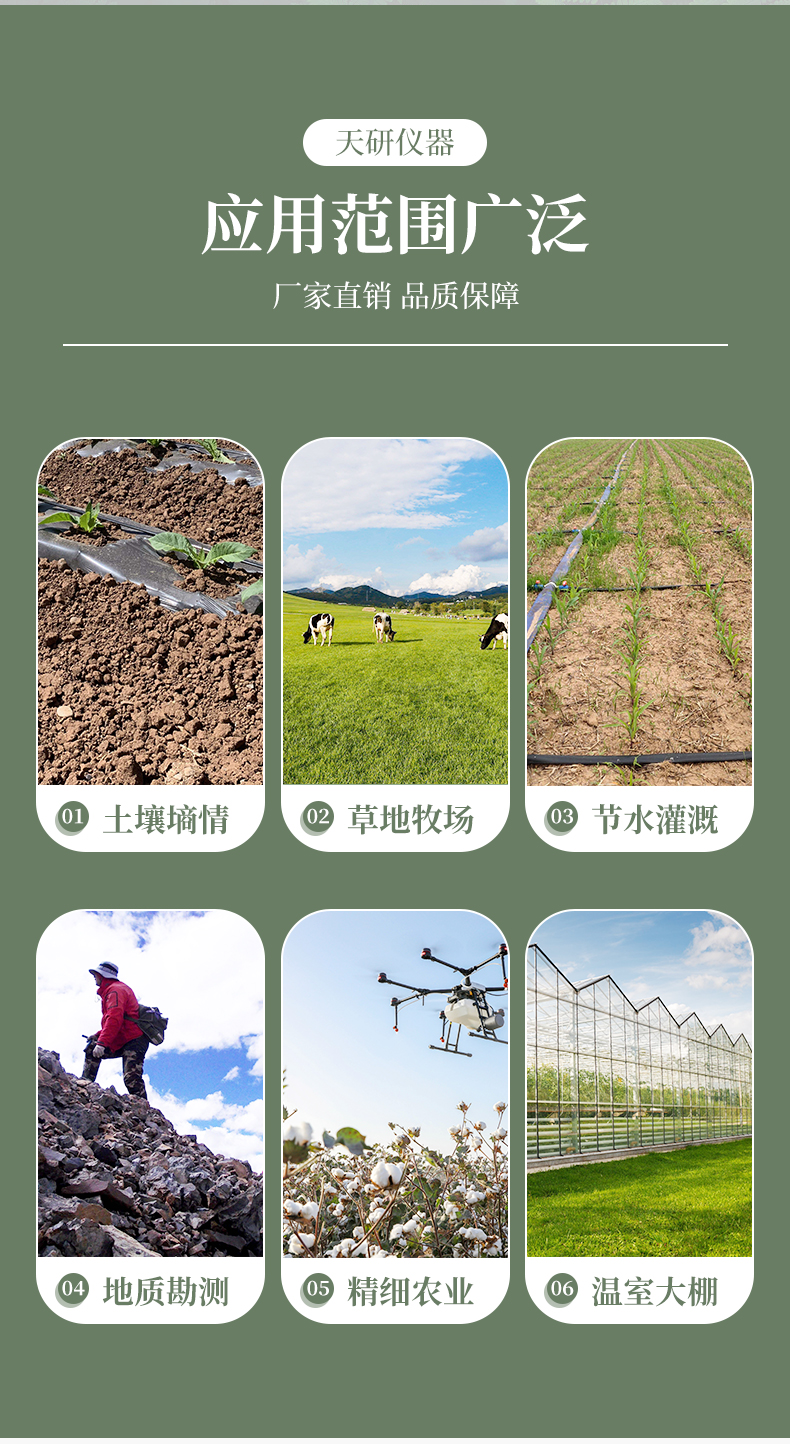 產(chǎn)品描述:產(chǎn)品簡介: 土壤水分溫度鹽分測定儀傳感器采用一體化結構設計,可快速準確測量土壤中含水量、溫度和電導率(鹽分),可對多處樣地、不同土壤深度的水分含量溫度和鹽分進行快速檢測和長期連續(xù)監(jiān)測。廣泛應用于土壤墑情檢測、旱作節(jié)水灌溉、精細農(nóng)業(yè)、林業(yè)、地質勘探、植物培育、水利、環(huán)保等領域?!驹斍椤?/p> 咨詢熱線:15854444001 在線咨詢技術熱線